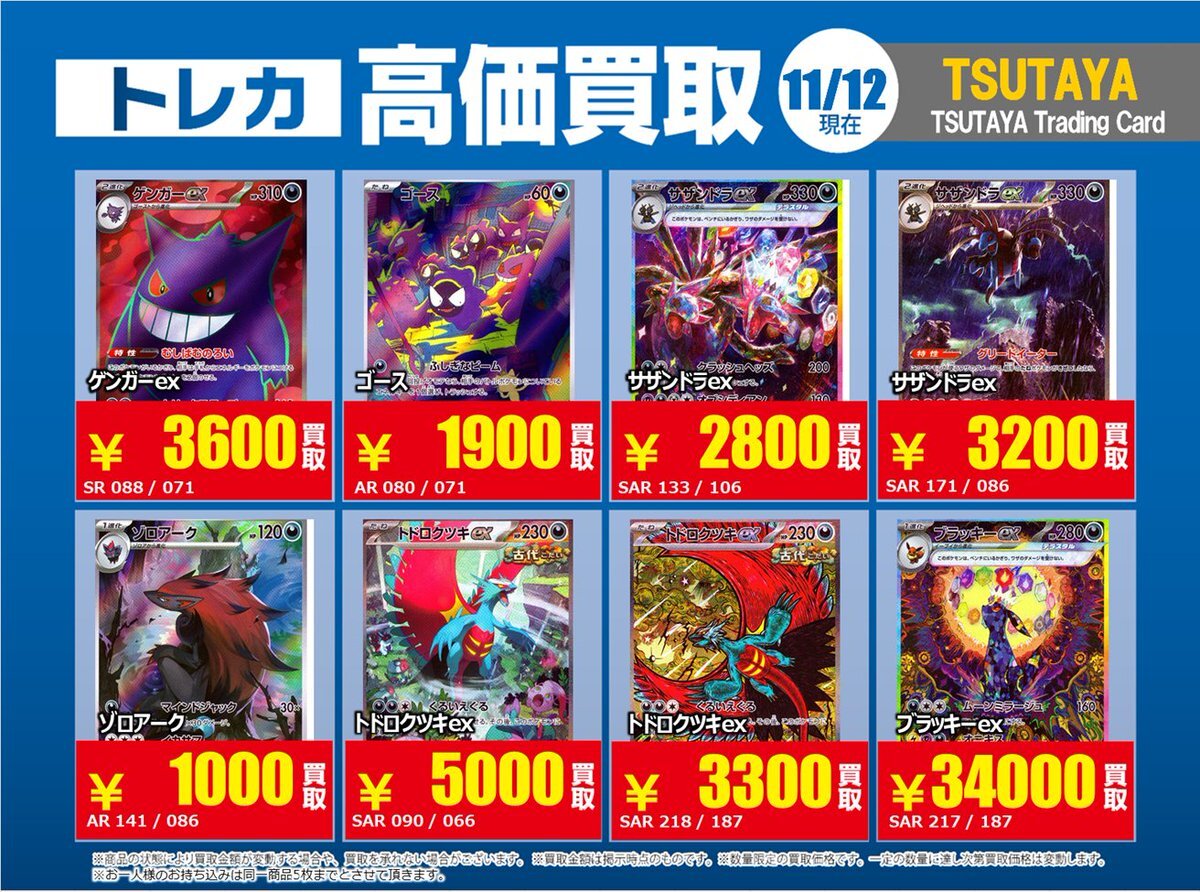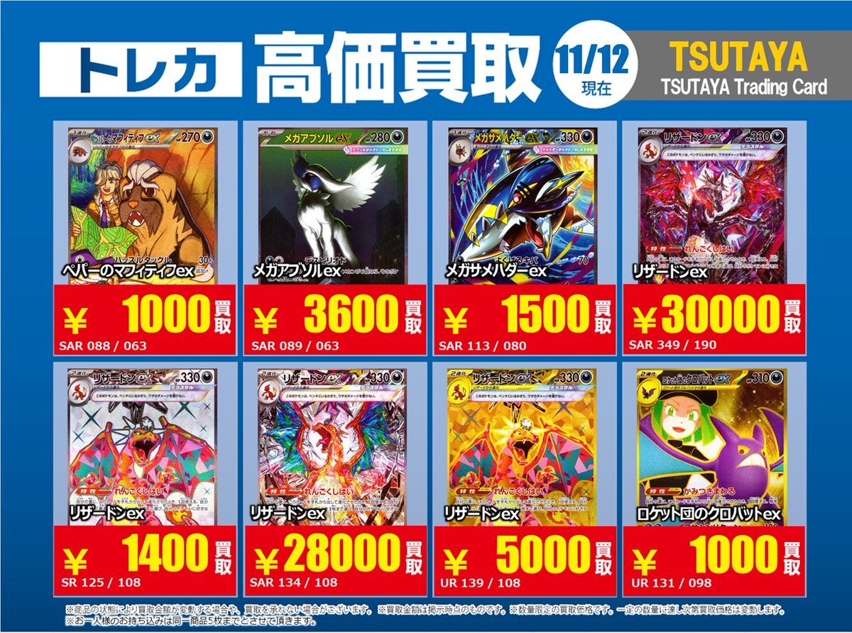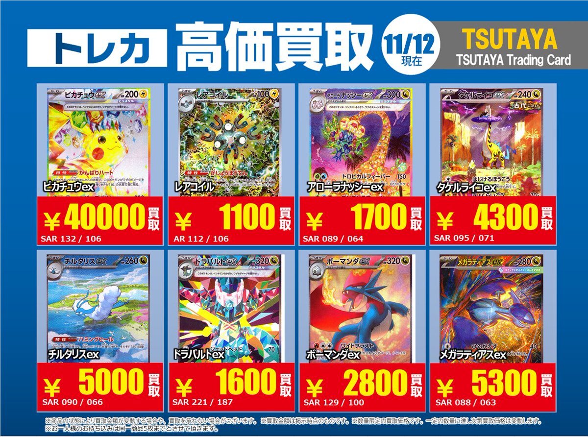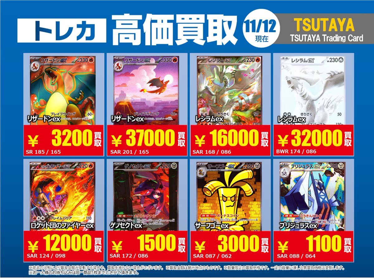 【高価買取情報】 11/4まで #ポケモンゲーム #高額 ⑧高価買取商品をお持ち頂く場合は レジにてX掲載カードと必ずお伝え下さい。 申告が無い場合は通常価格での買取 となってしまいますのでお気を付け下さい。 ※在庫状況や商品状態で買取価格が変動 または終了する事がございます #TTC錦糸町店 pic.x.com/HFcM4h5SpL