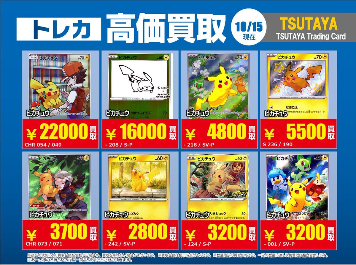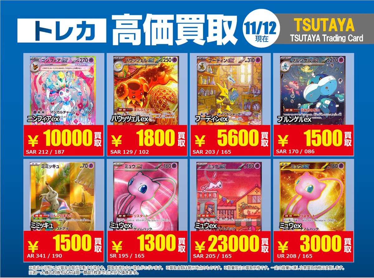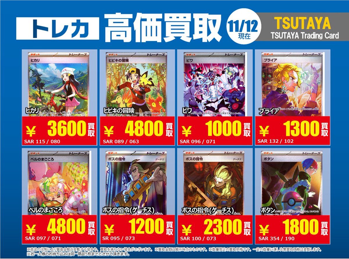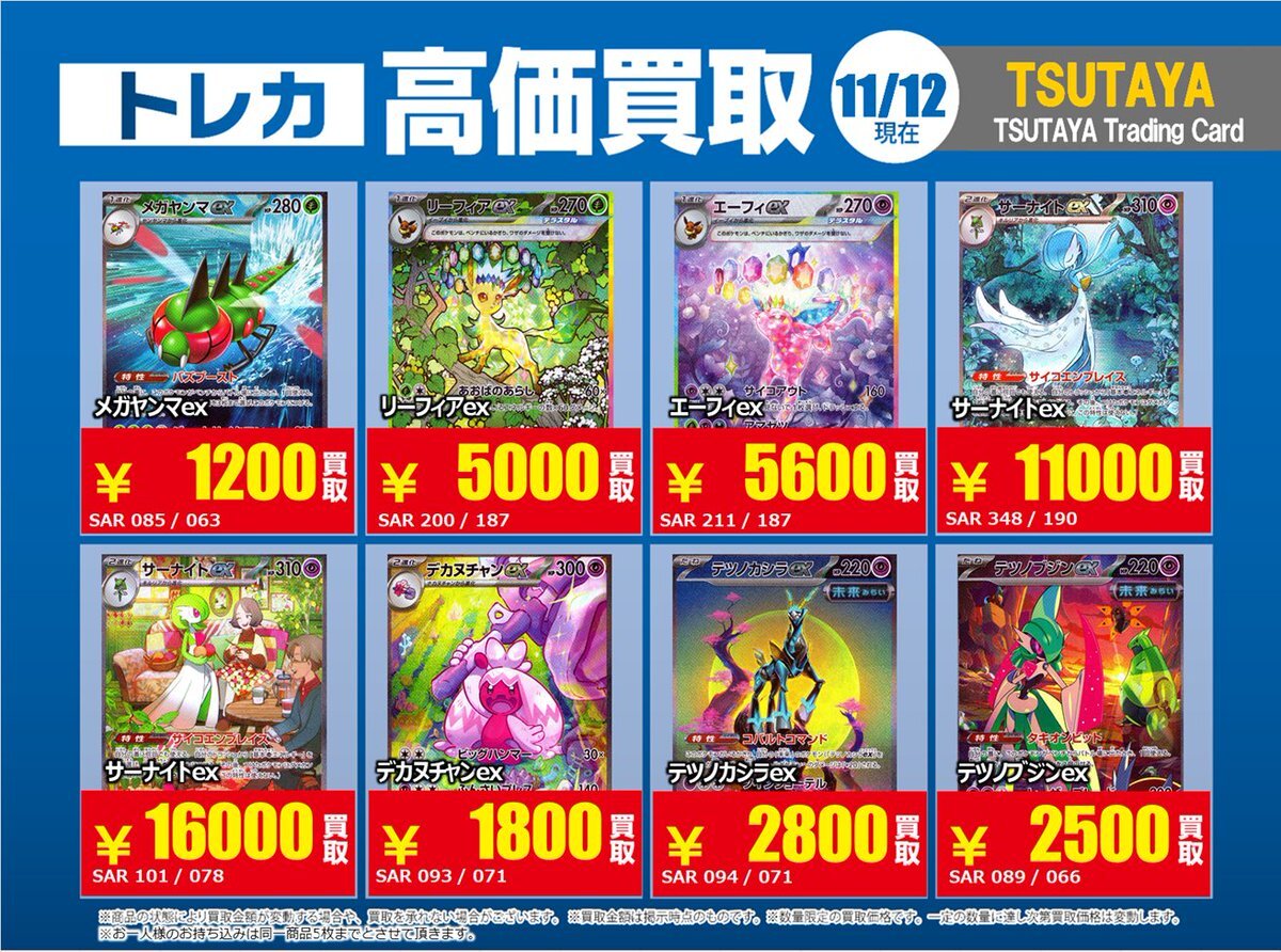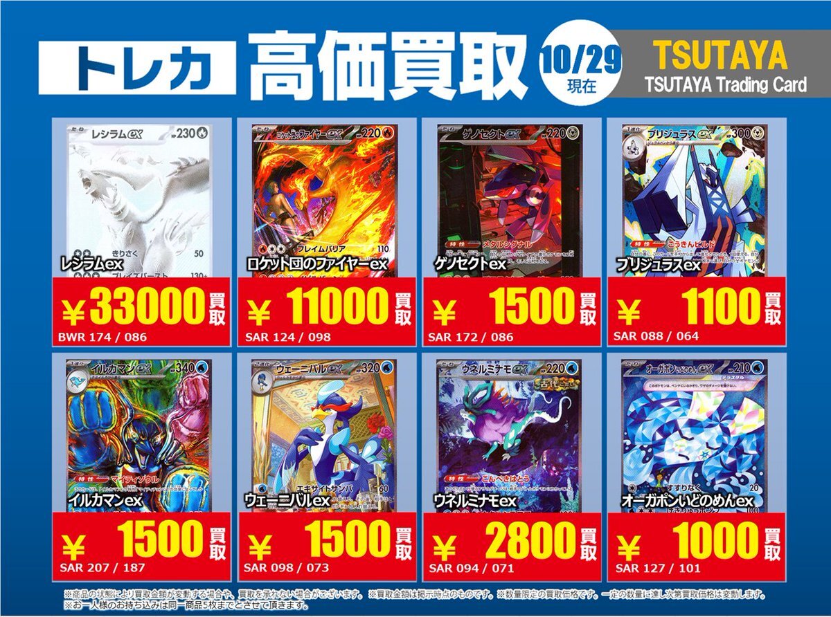 【高価買取情報】 11/4まで #ポケモンゲーム #高額 ⑧高価買取商品をお持ち頂く場合は レジにてX掲載カードと必ずお伝え下さい。 申告が無い場合は通常価格での買取 となってしまいますのでお気を付け下さい。 ※在庫状況や商品状態で買取価格が変動 または終了する事がございます #TTC錦糸町店 pic.x.com/HFcM4h5SpL