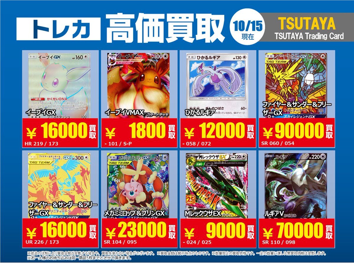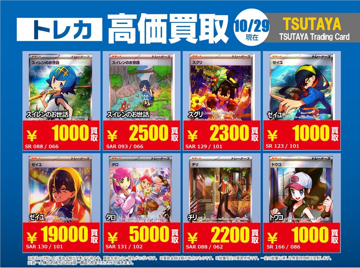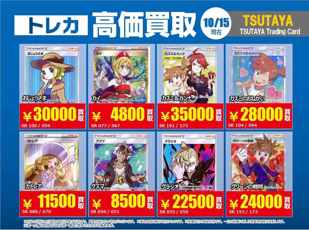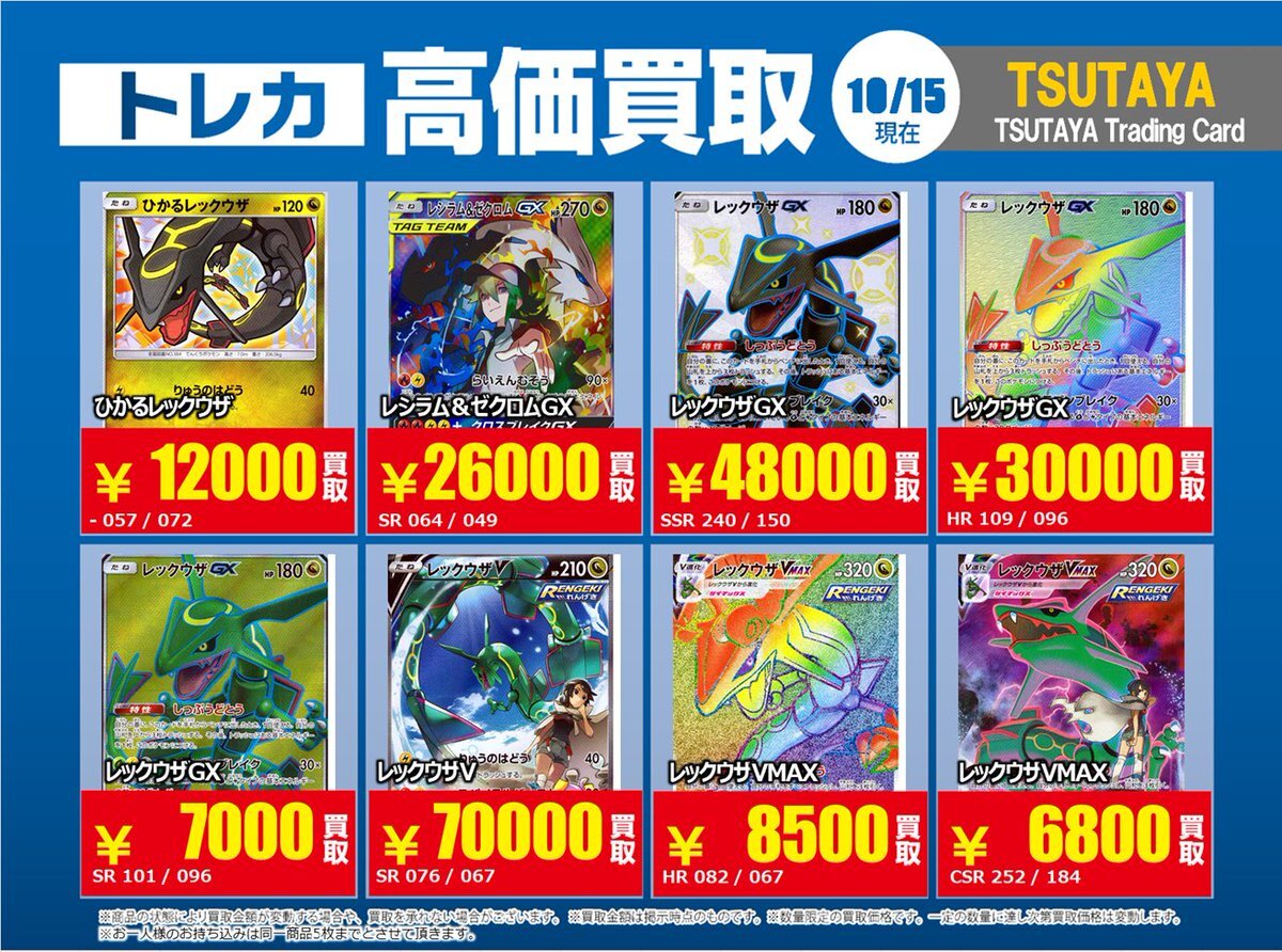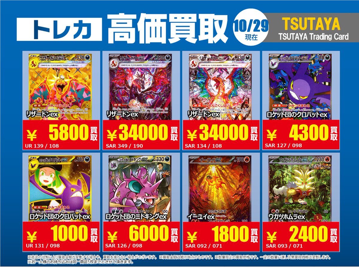 【高価買取情報】 10/28まで #ポケモンカード #エクストラ ⑤ 高価買取商品をお持ち頂く場合は レジにてX掲載カードと必ずお伝え下さい。 申告が無い場合は通常価格での買取 となってしまいますのでお気を付け下さい ※在庫状況や商品状態で買取価格が変動 または終了する事がございます #TTC錦糸町店 pic.x.com/WSz6NfOhMl