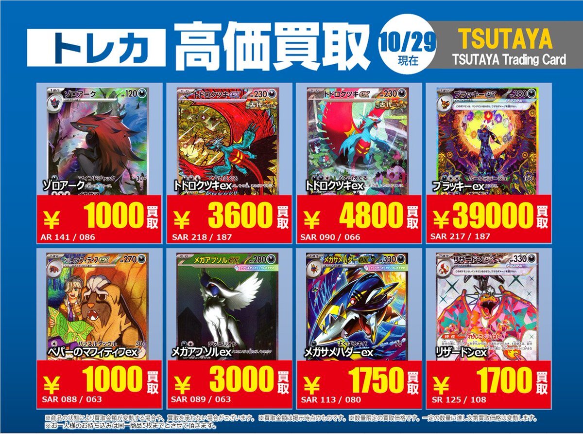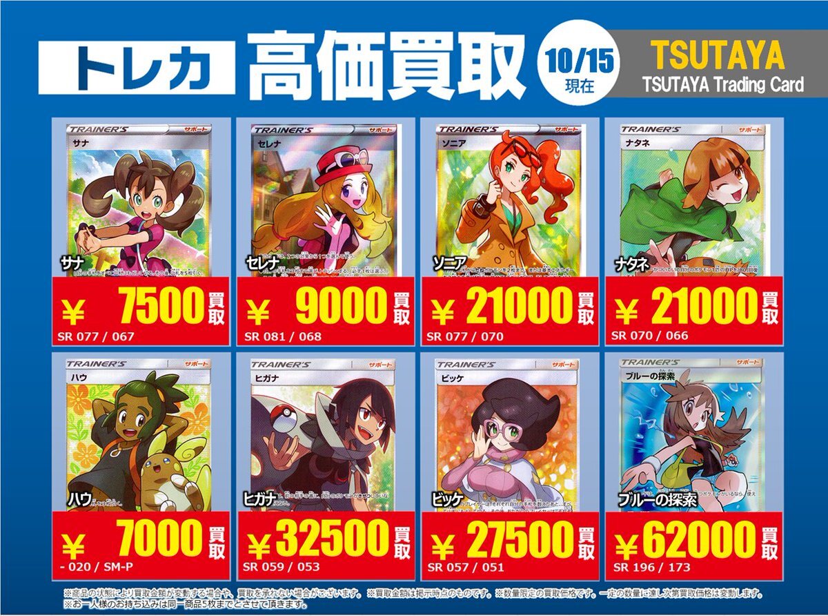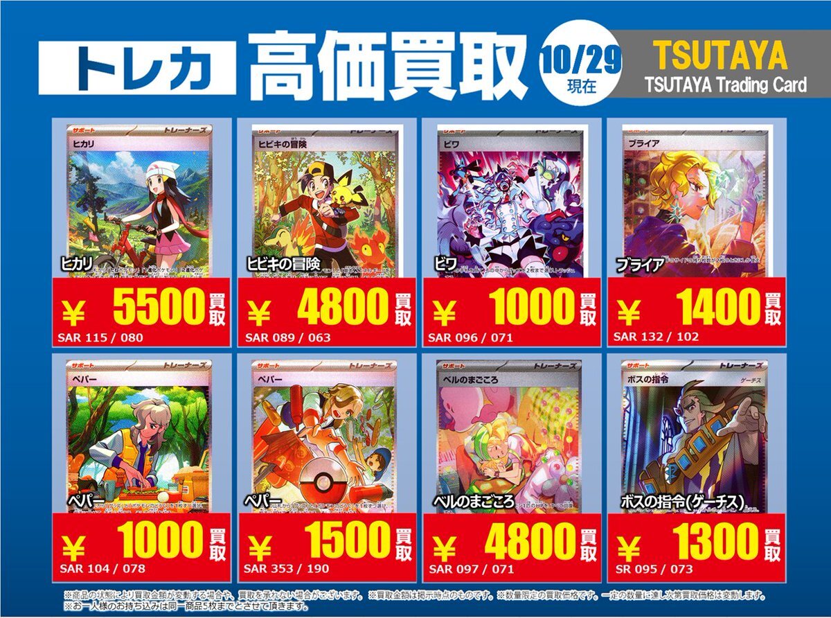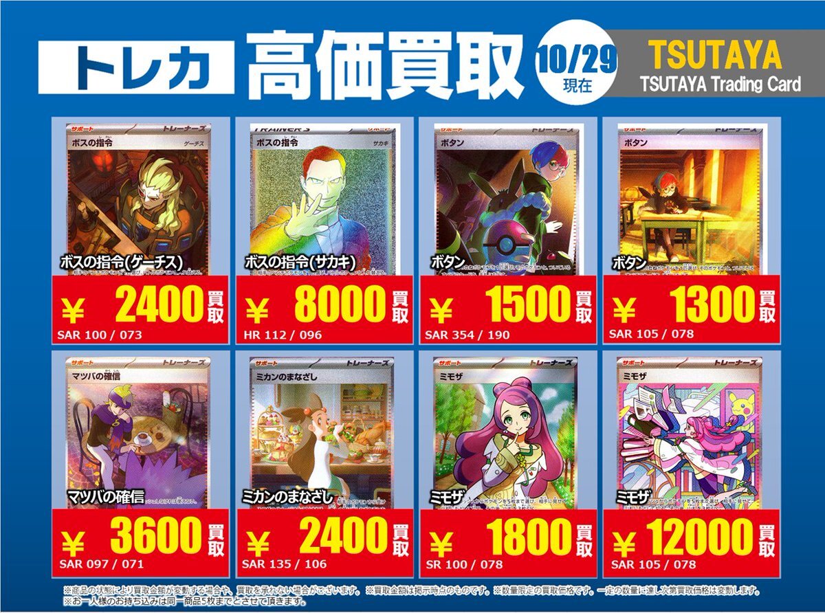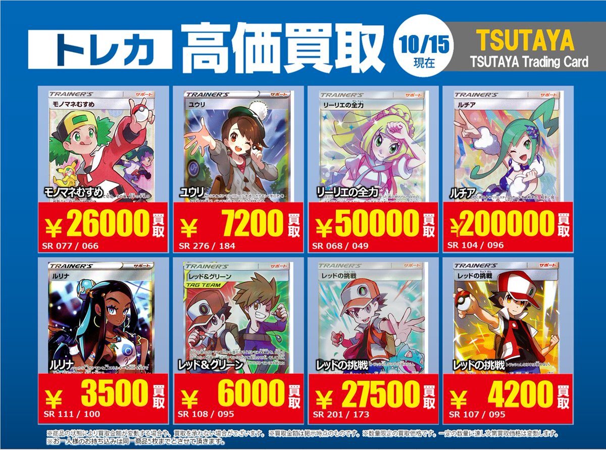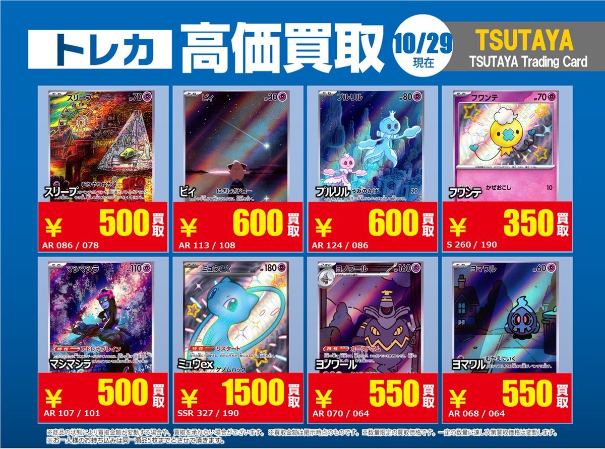 【高価買取情報】 10/28まで #ポケモンカード #エクストラ ⑤ 高価買取商品をお持ち頂く場合は レジにてX掲載カードと必ずお伝え下さい。 申告が無い場合は通常価格での買取 となってしまいますのでお気を付け下さい ※在庫状況や商品状態で買取価格が変動 または終了する事がございます #TTC錦糸町店 pic.x.com/WSz6NfOhMl