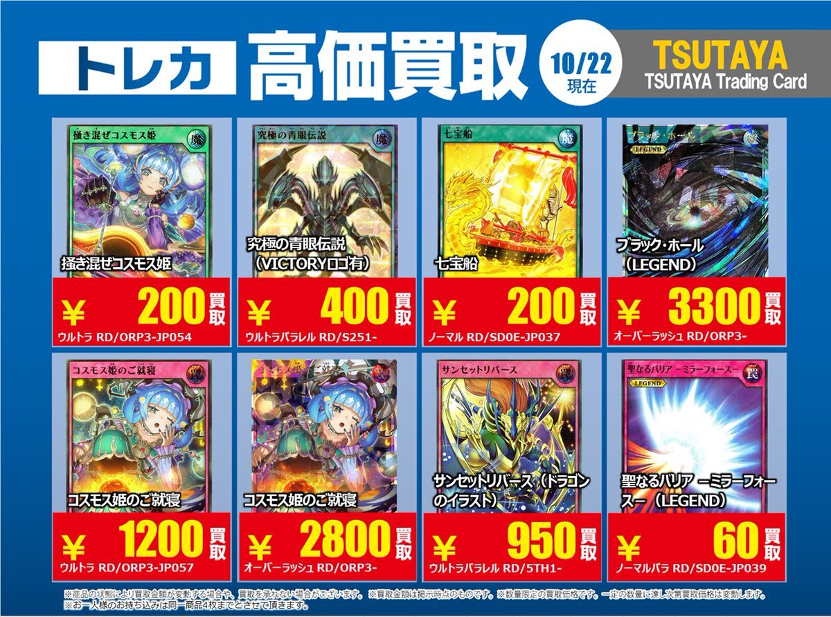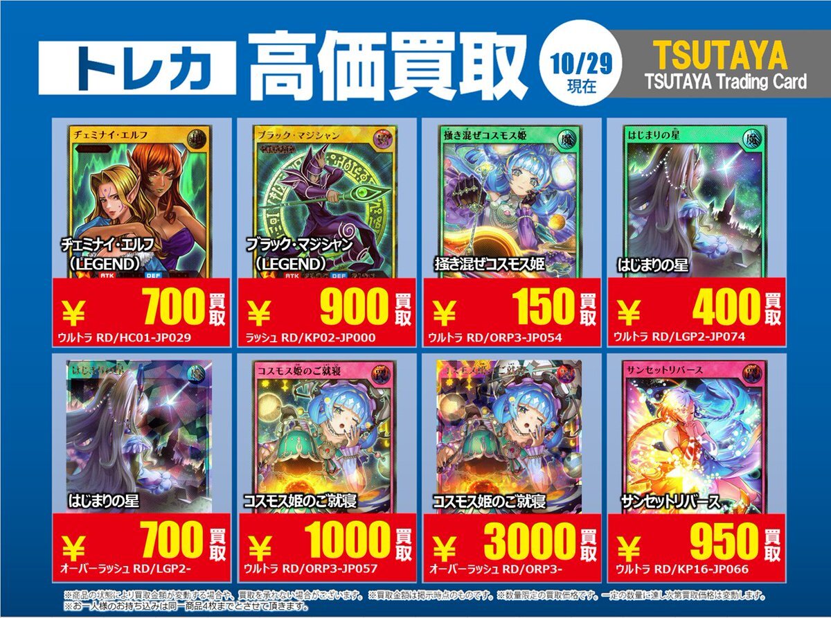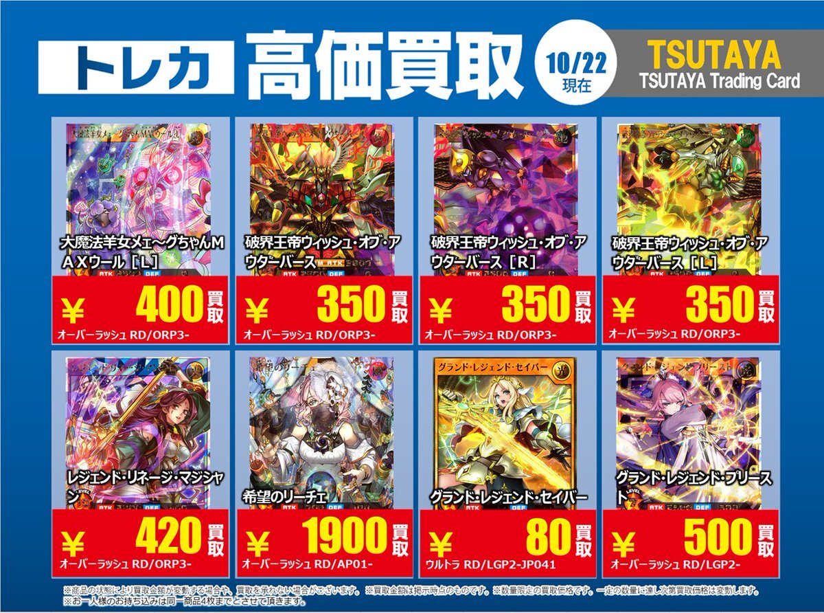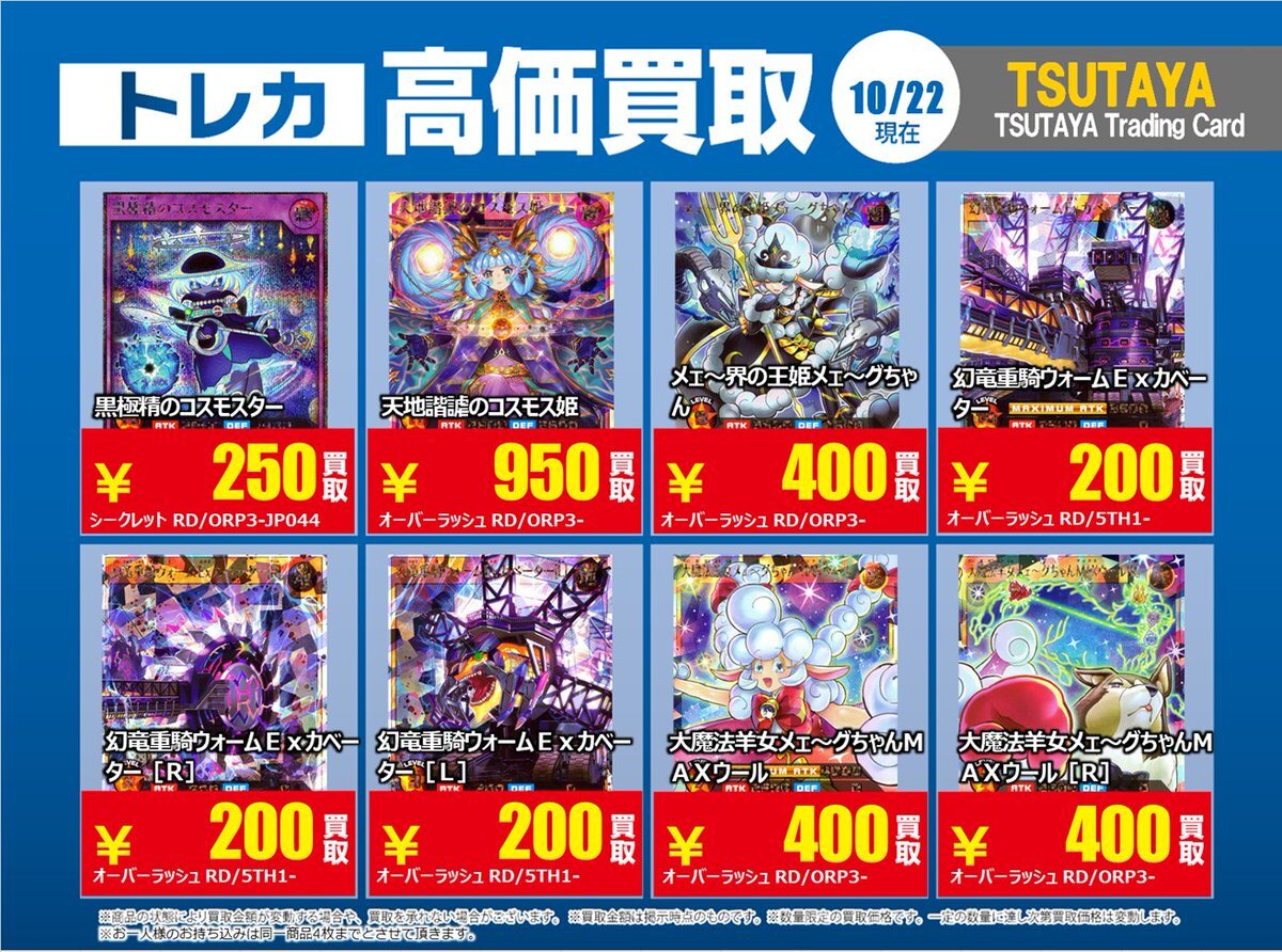 【高価買取情報】 10/28まで #遊戯王ラッシュデュエル 高価買取商品をお持ち頂く場合は レジにてX掲載カードと必ずお伝え下さい。 申告が無い場合は通常価格での買取 となってしまいますのでお気を付け下さい ※在庫状況や商品状態で買取価格が変動 または終了する事がございます #TTC錦糸町店 pic.x.com/AUY0DxkCtK