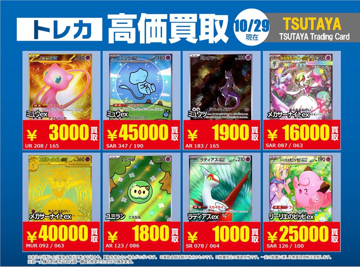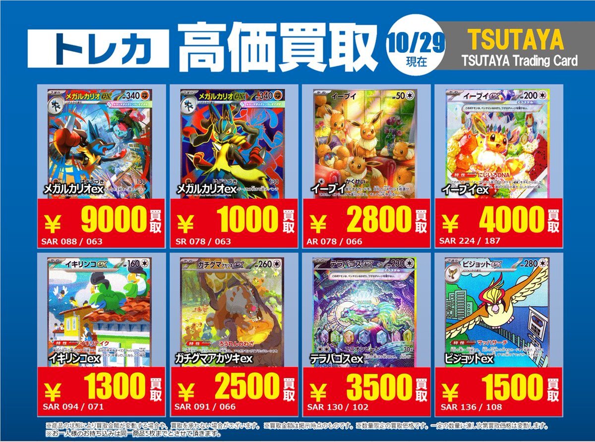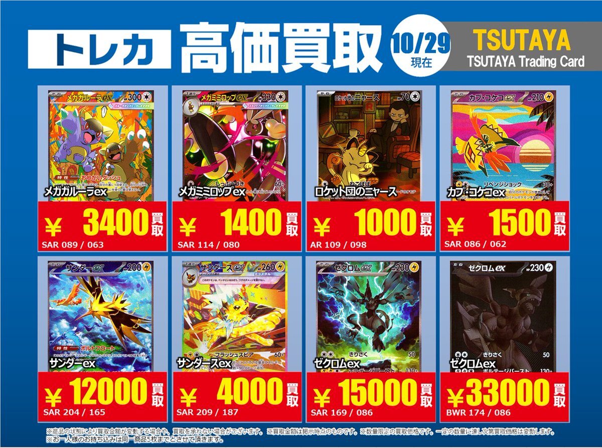 【高価買取情報】 10/28まで #ポケモンカード #エクストラ ③ 高価買取商品をお持ち頂く場合は レジにてX掲載カードと必ずお伝え下さい。 申告が無い場合は通常価格での買取 となってしまいますのでお気を付け下さい ※在庫状況や商品状態で買取価格が変動 または終了する事がございます #TTC錦糸町店 pic.x.com/f9py1OIkgx