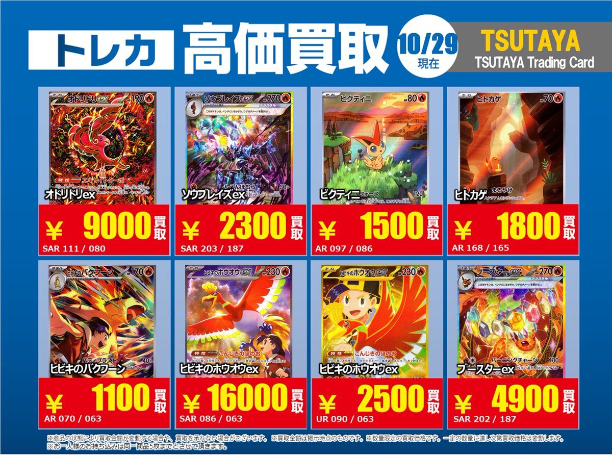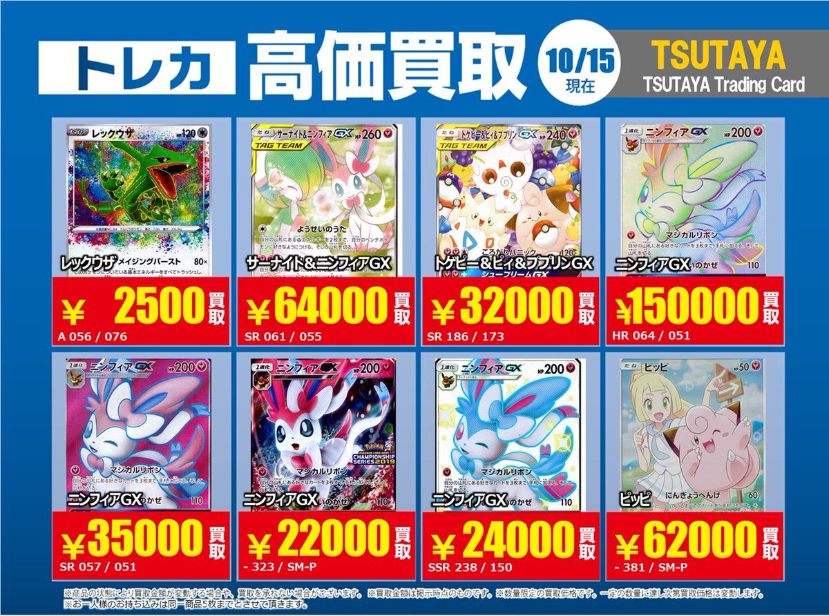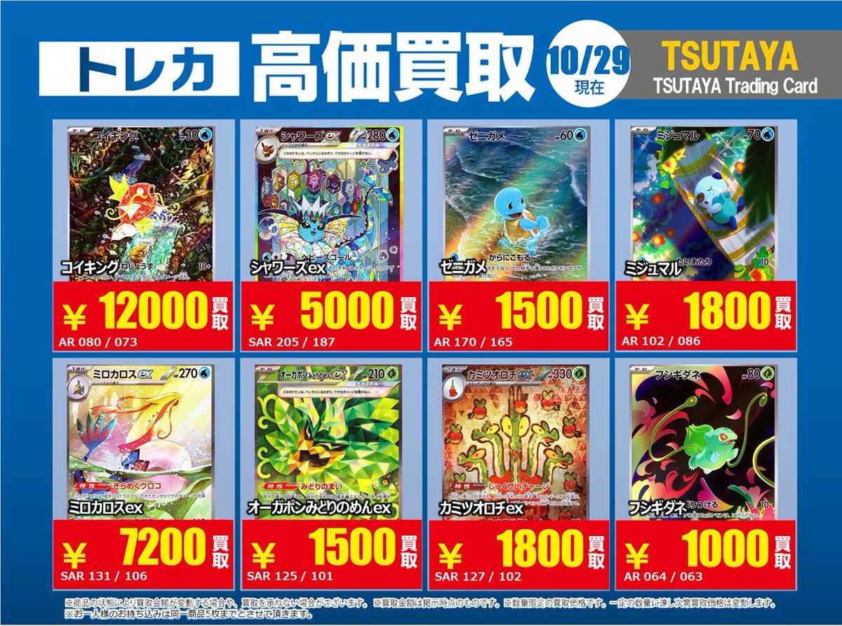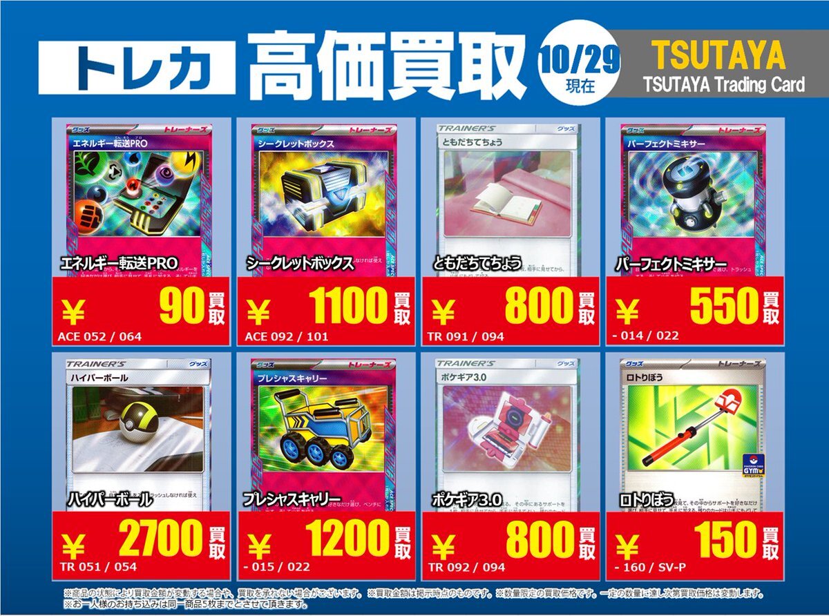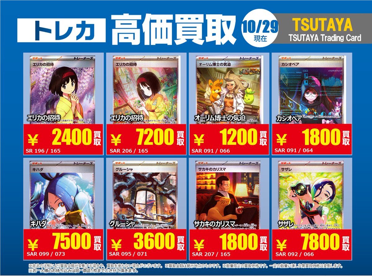 【高価買取情報】 10/28まで #ポケモンカード #エクストラ ⑥ 高価買取商品をお持ち頂く場合は レジにてX掲載カードと必ずお伝え下さい。 申告が無い場合は通常価格での買取 となってしまいますのでお気を付け下さい ※在庫状況や商品状態で買取価格が変動 または終了する事がございます #TTC錦糸町店 pic.x.com/7tCNeHgeSs