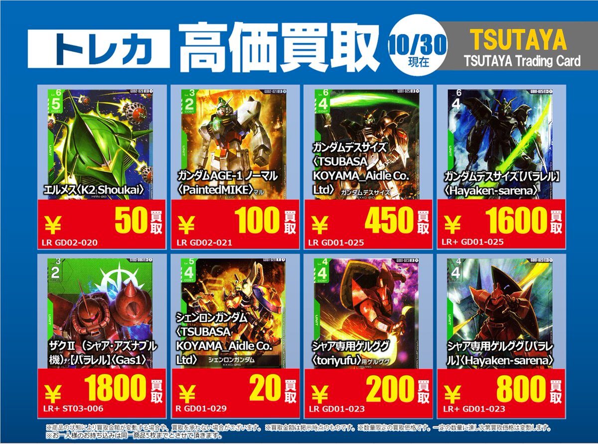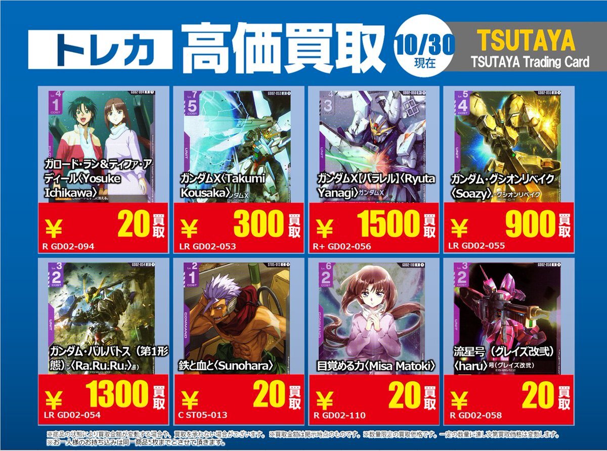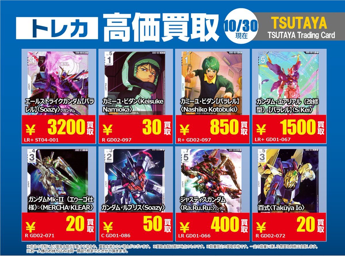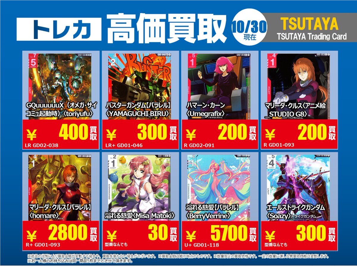 【高価買取情報】 11/4で #ガンダムカード ① 高価買取商品をお持ち頂く場合はレジにてX掲載カードと必ずお伝え下さい。 申告が無い場合は通常価格での買取となってしまいますのでお気を付け下さい。 ※在庫状況や商品状態で買取価格が変動または終了する事がございます。 #TTC錦糸町店 pic.x.com/czpaSFB5Wc
