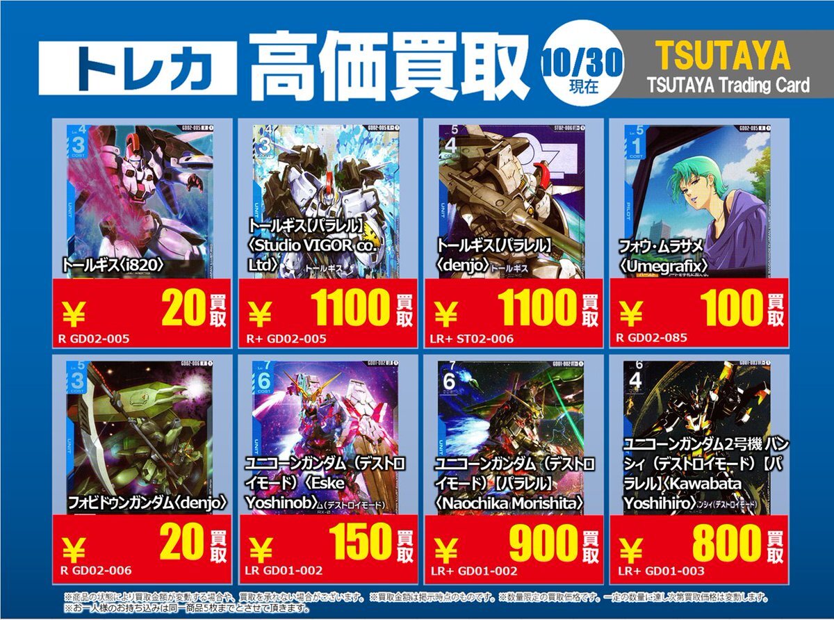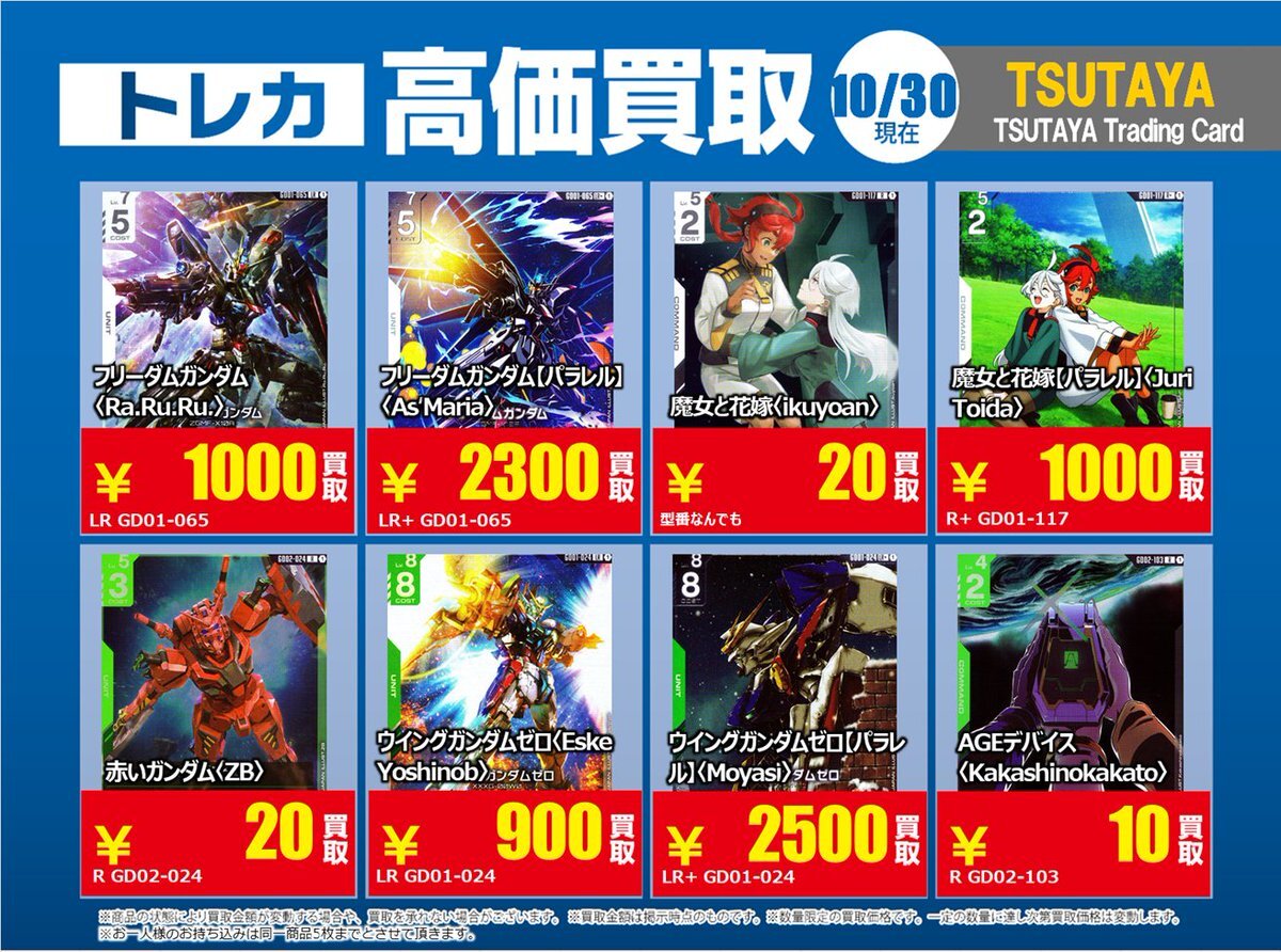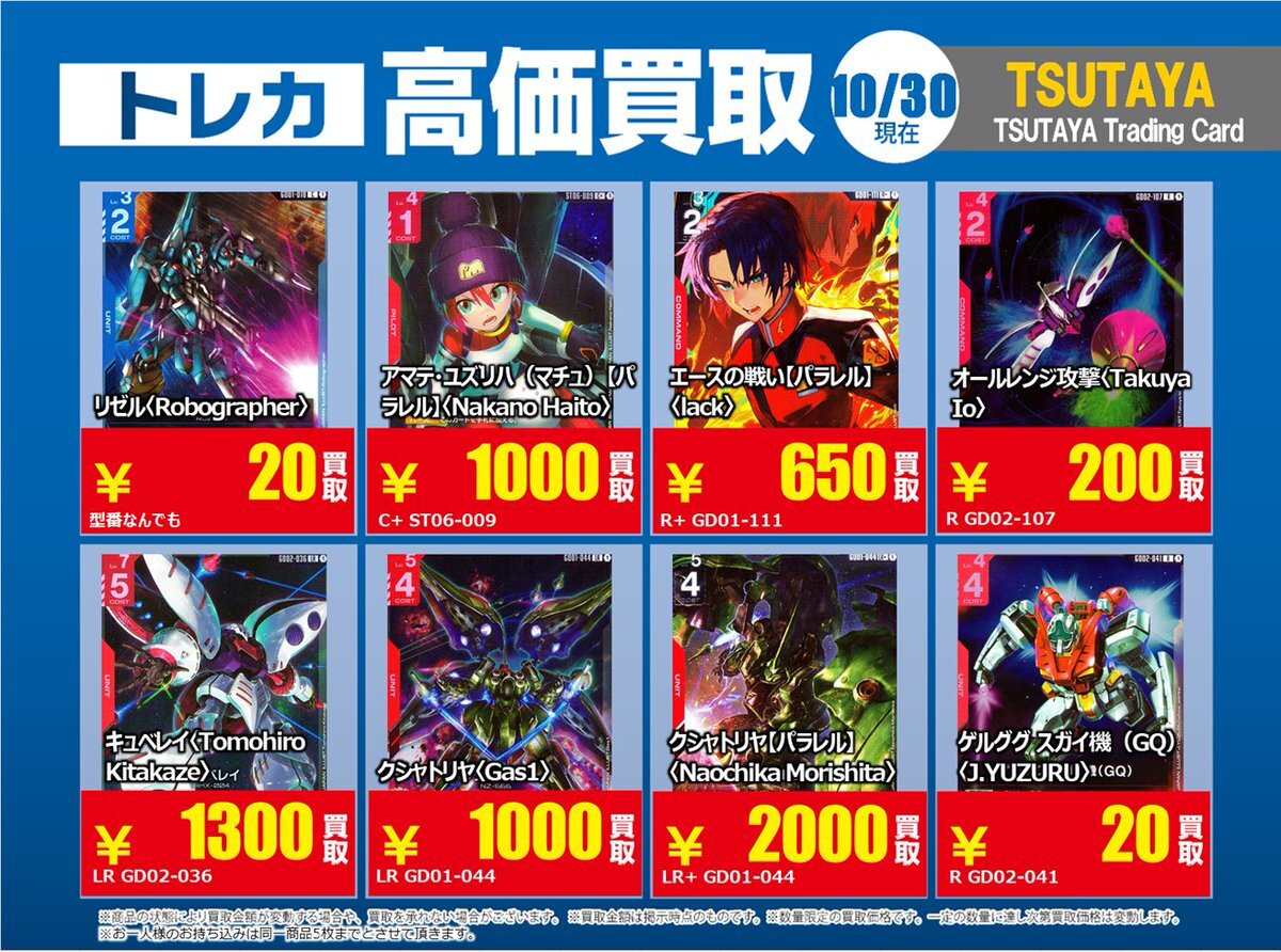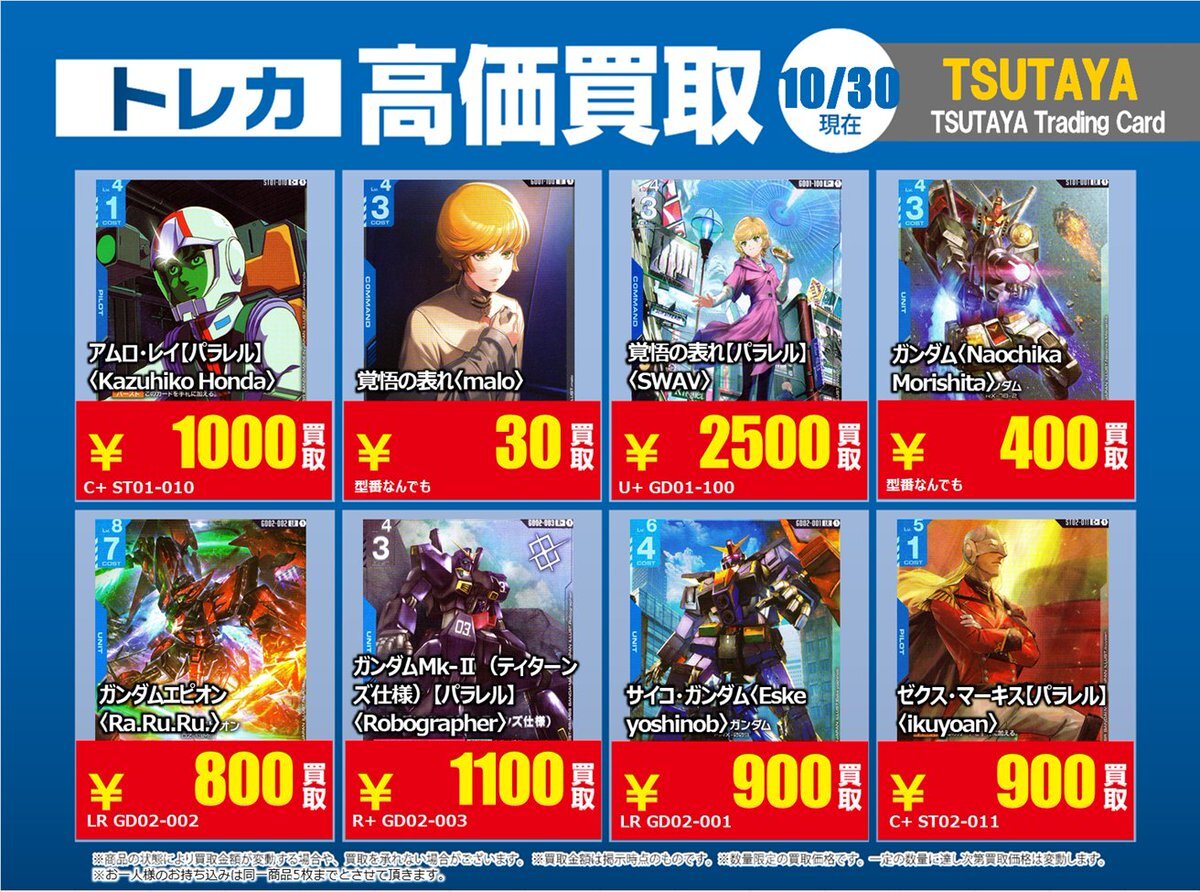 【高価買取情報】 11/4で #ガンダムカード ① 高価買取商品をお持ち頂く場合はレジにてX掲載カードと必ずお伝え下さい。 申告が無い場合は通常価格での買取となってしまいますのでお気を付け下さい。 ※在庫状況や商品状態で買取価格が変動または終了する事がございます。 #TTC錦糸町店 pic.x.com/czpaSFB5Wc