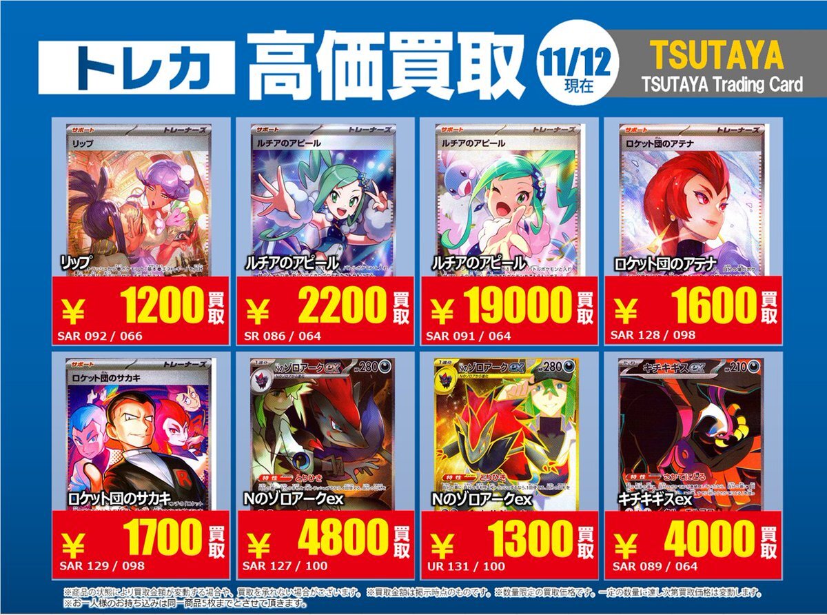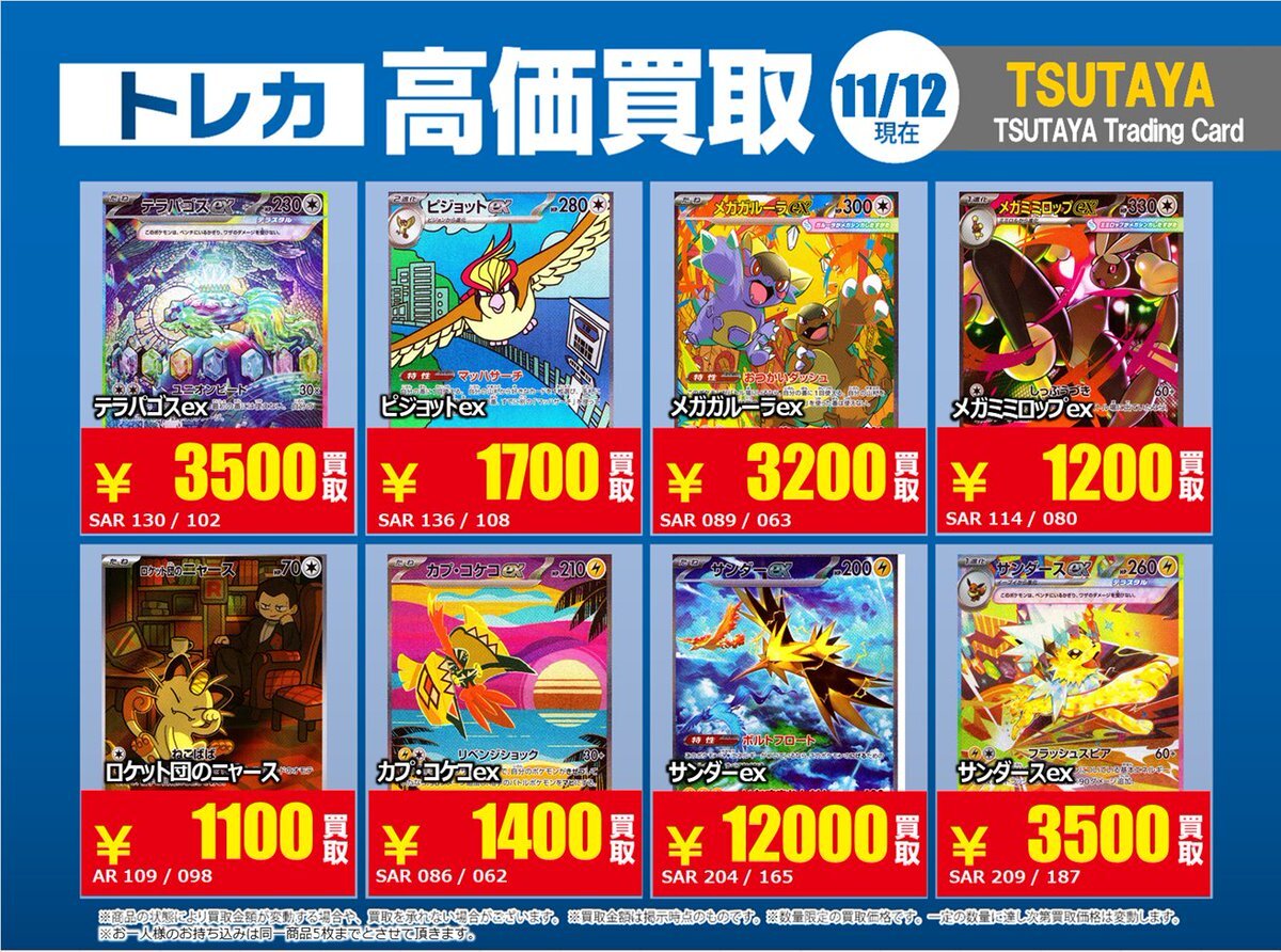 【高価買取情報】 11/18まで #ポケモンゲーム #高額 ① 高価買取商品をお持ち頂く場合は レジにてX掲載カードと必ずお伝え下さい。 申告が無い場合は通常価格での買取 となってしまいますのでお気を付け下さい。 ※在庫状況や商品状態で買取価格が変動 または終了する事がございます #TTC錦糸町店 pic.x.com/G2fEaN4tTt