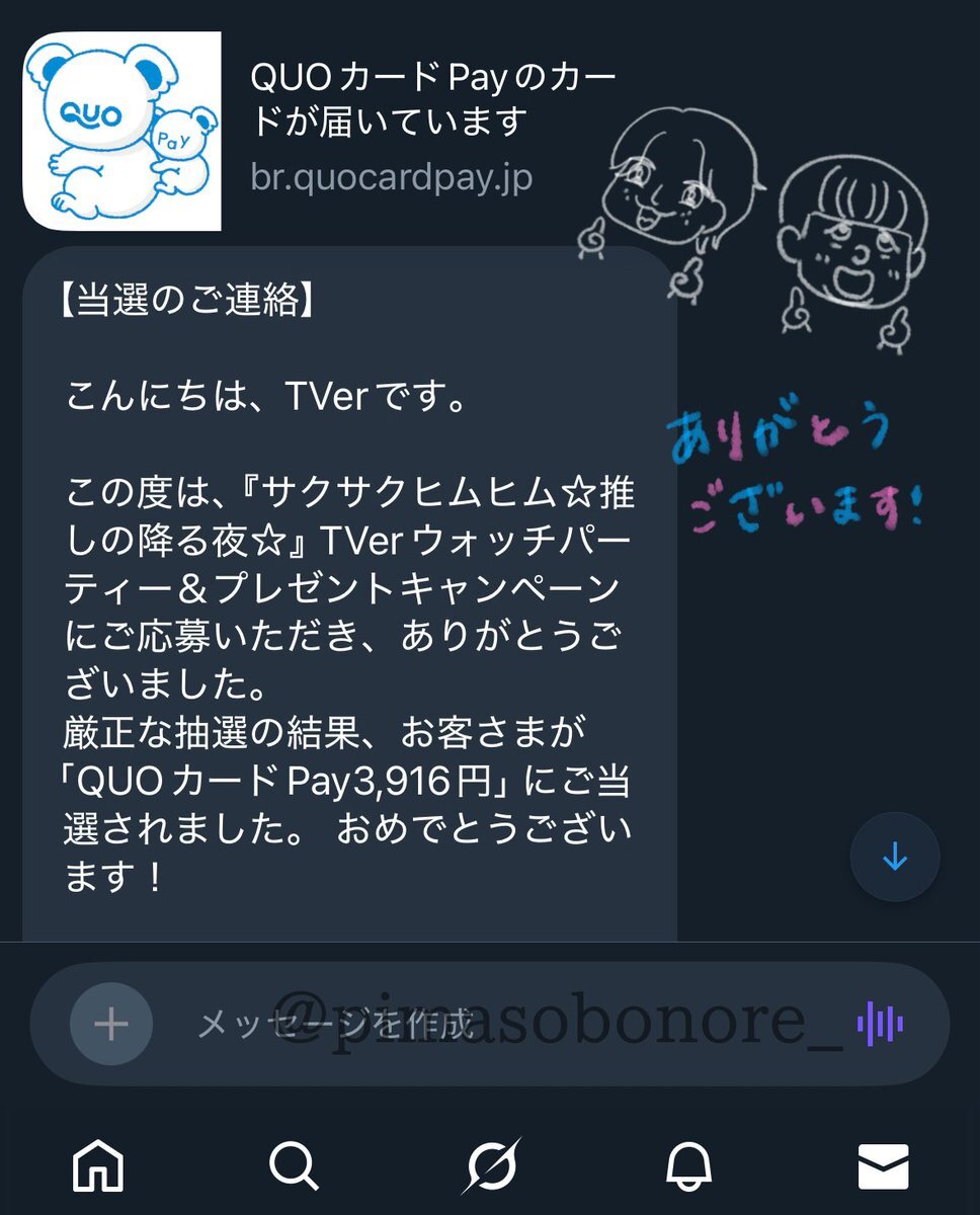 本当にびっくりしたのですが、サクサクヒムヒムのウォッチパーティーのキャンペーンに当選しました🥹とっても楽しい企画だったので、またぜひやって欲しいな💭 頂戴した3,916(サクヒム)円は折角のご縁なので推し活に使います、ありがとうございます💕🪄 #サクサクヒムヒム #tverでサクサクヒムヒム pic.x.com/ay0PiywafH x.com/tver_oshikatsu…