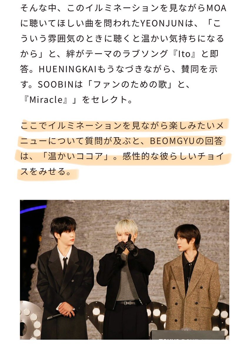 最高、温かいココア最高…!!! 他にもnon-noさんのこちらの記事、全体的にすごく素敵でほっこりしました🥰 ありがとうございます♡ #TOMORROW_X_TOGETHER #Starkissed #TXTと過ごす冬 pic.x.com/B82muneXKS x.com/nonno_staff/st…