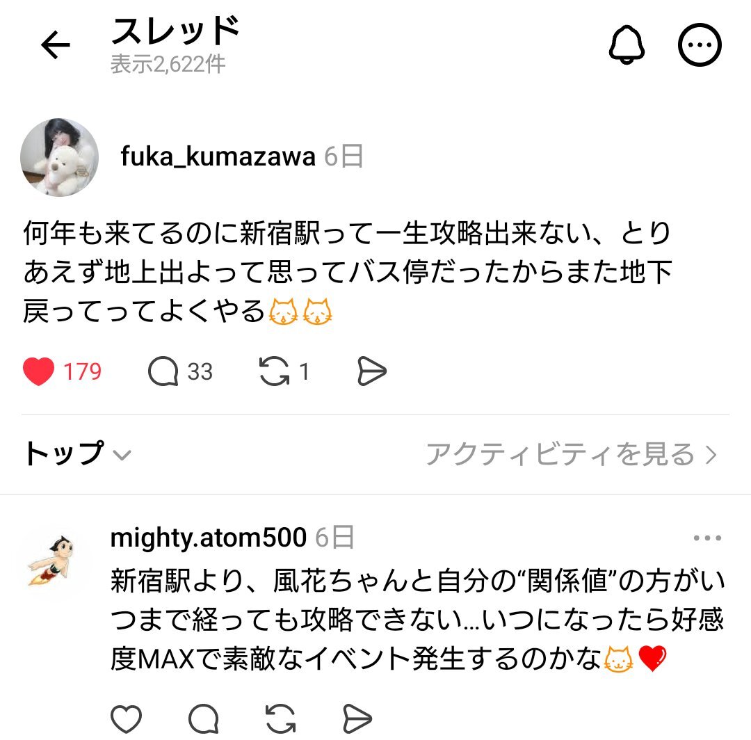 風花ちゃんおはよー! 昨日はフリラ楽しかった🎶 (コメントは3つ渡した中から選択) ふ)( コメント見ながら) なんかさーこの前SNSでコメントしてくれてたよね なんだっけ? ア)Threadsかな😳 素敵なイベント待ってます笑 熊澤風花 @Task_fuuka #熊澤風花 #TaskhaveFun pic.x.com/WyCfXQTz9E