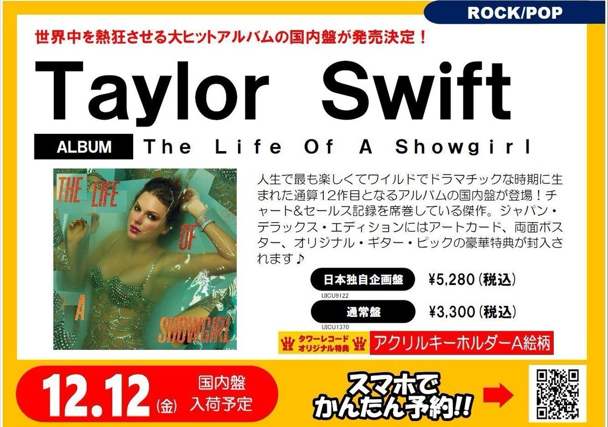 【#TaylorSwift】 #テイラー・スウィフト 全世界で大ヒット中の最新アルバム 『The Life Of A Showgirl』国内盤が12/12(金)リリース決定👏 紙ジャケ仕様/ギターピック等封入のジャパン・デラックス・エディションも🎁 ご予約受付中です📢📢 tower.jp/article/featur… #TheLifeOfAShowgirl pic.x.com/eiKr1Ylwtr
