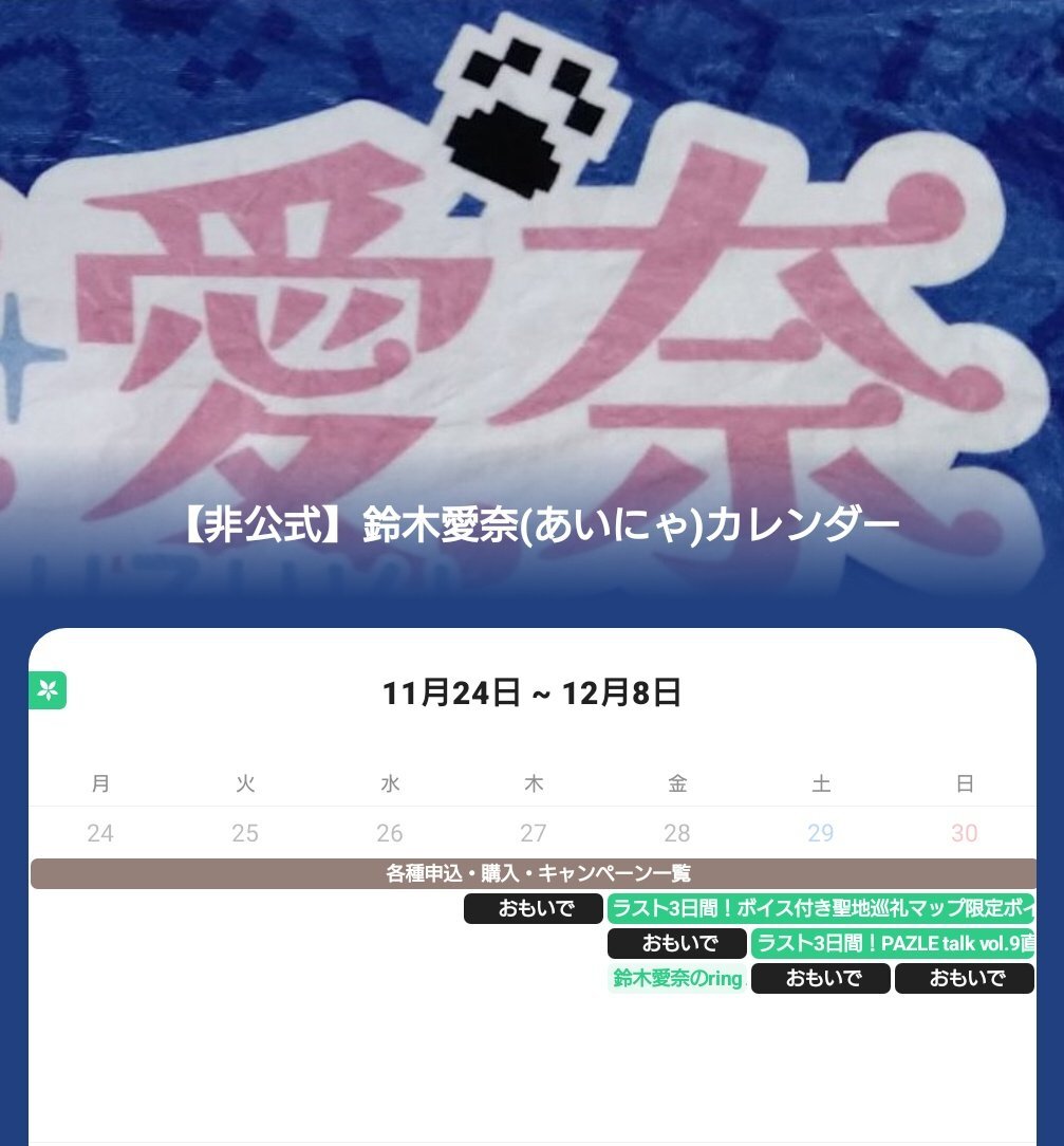 もう11月終わる?年末が来る??😅 【今週のTOPICS】 11/28(金) ・リンラジ配信📻️ 11/30(日) ・邪神ちゃんボイス付き聖地巡礼マップ限定ボイス配信最終日🐍 #鈴木愛奈 #TimeTreePublic #TimeTree公開カレンダー timetr.ee/p/ainya_calend… pic.x.com/SZLBLHGOdN