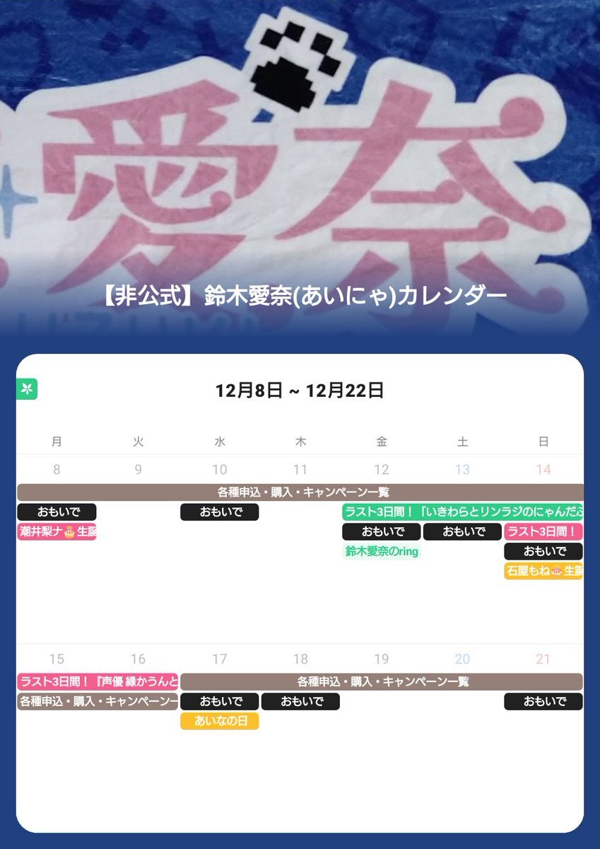 【今週のTOPICS】 12/12(金) ・リンラジ配信📻️ 12/14(日) ・「いきわらとリンラジのにゃんだふるな1日」音泉PREMIUMサポーター先行抽選申込締切 #鈴木愛奈 #TimeTreePublic #TimeTree公開カレンダー timetr.ee/p/ainya_calend… pic.x.com/n3Q4CP6vm4