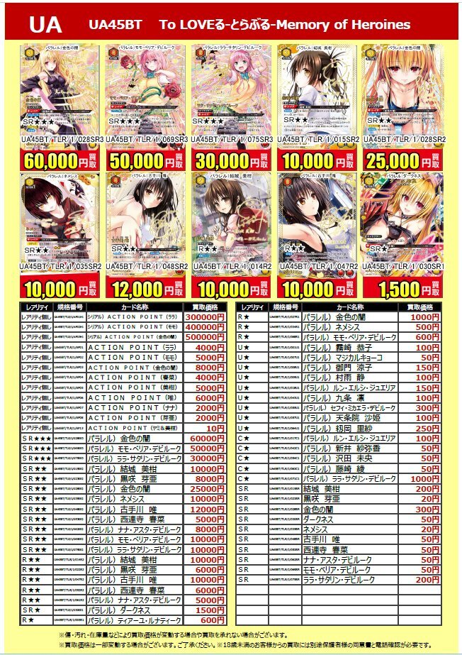 🔥トレカ買取価格情報🔥 11/14(金)発売 #ユニオンアリーナ #ToLOVEるダークネス #MemoryofHeroines 11/19現在の買取価格表 お売り頂ける物がございましたら 是非当店へお持ち込み下さい ※カードの状態、在庫数により価格変動する場合があります #トレカ買取 #ユニアリ #とらぶる pic.x.com/Clw7lUNrnf