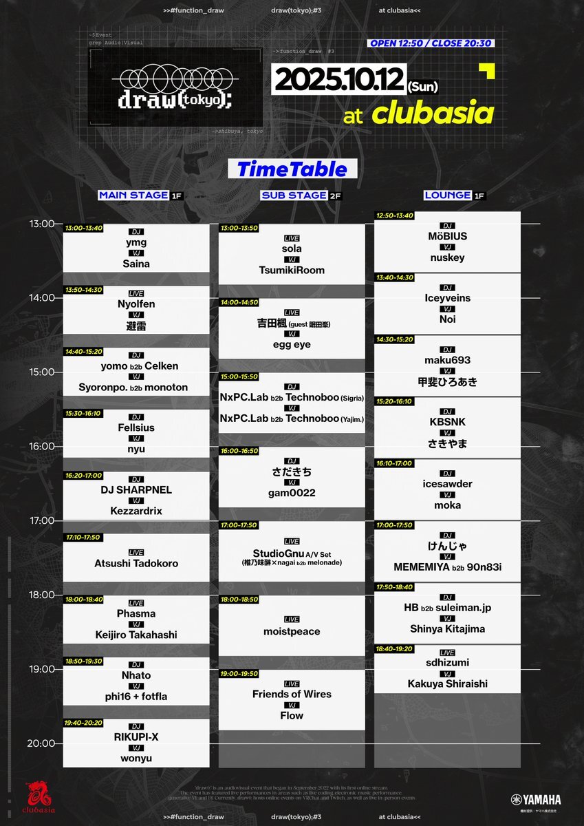【🎉タイムテーブル公開🎉】 draw(tokyo); #3 | #function_draw 🗓️2025/10/12 (日) 12:50~20:30 🏙️clubasia (東京 渋谷) 🎟️前売り¥4000+1D 🎟️22歳以下¥3000+1D タイムテーブルが公開されました! 3フロア駆け巡りましょう🔥 ▼チケット購入はこちらから▼ draw-tokyo3.peatix.com