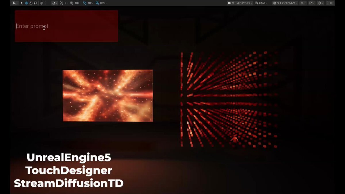 UnrealEngineでプロンプト入力(OSC出力)TouchDesignerにOSC受けて、映像生成、NDIにてUnrealEngine(Mediaplayer)に戻す(パソコン-1)NDIを受けてTouchDesignerで3DPixelMappingして、UEにArtnet送る(パソコン-2) #UnrealEngine5 #touchdesigner #StreamDiffusionTD #Artnent #AI