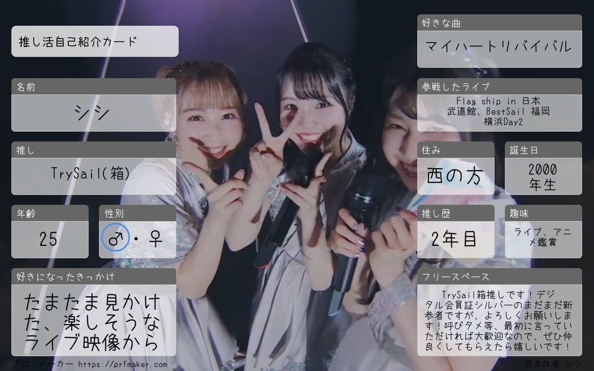 推しアカ作って1ヶ月ということで、自己紹介カードを作ってみました! 関東圏から遠く離れてるので、現場は行けるものが限られますが、これをきっかけにお話できる方が増えたら嬉しいです!! #自己紹介カード #TrySail好きと繋がりたい #TrySail好きな人と繋がりたい pic.x.com/Z2iwKJlCo5