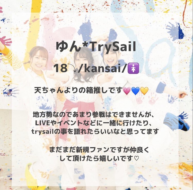 TrySail好きと繋がりたくて専用アカウント作りました あまり活発には浮上しないかもですけど、TrySail好きな人はよろしくお願いします🙇 #TrySail好きな人と繋がりたい #TrySail好きと繋がりたい #TrySail #いいねしてくださった方お迎え