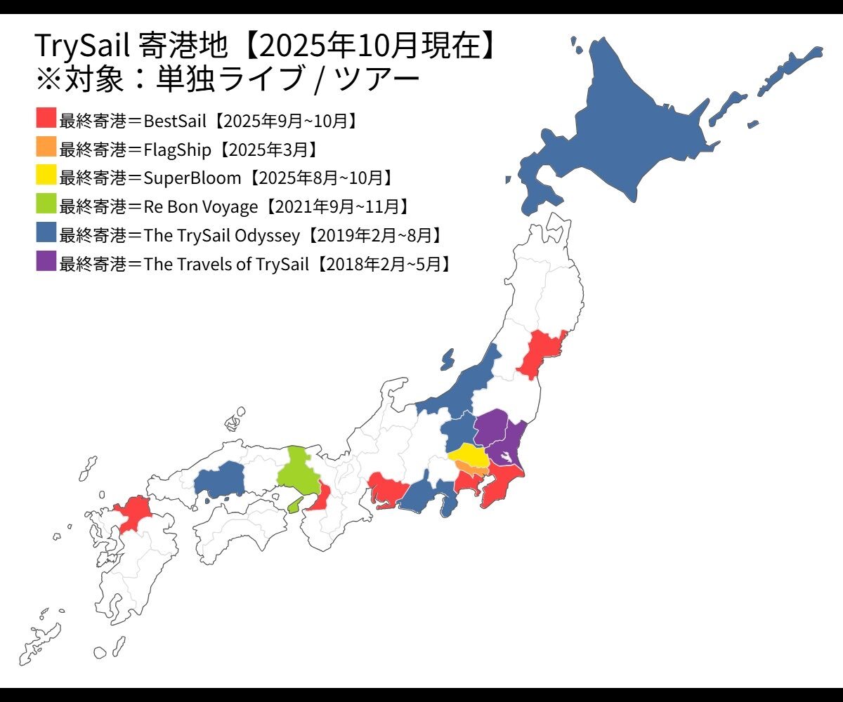 BestSailから1週間経って、これまでTrySailが"寄港"してきた場所をまとめてみました。(これまでの寄港は計16都道府県) こうして見るとOdysseyの規模感ってやっぱりすごい… 「次はここに来てほしい」みたいなのあれば、お話聞きたいです(*>△<)!! #TrySail #TrySail好きと繋がりたい #BestSail pic.x.com/lK971CqHZw