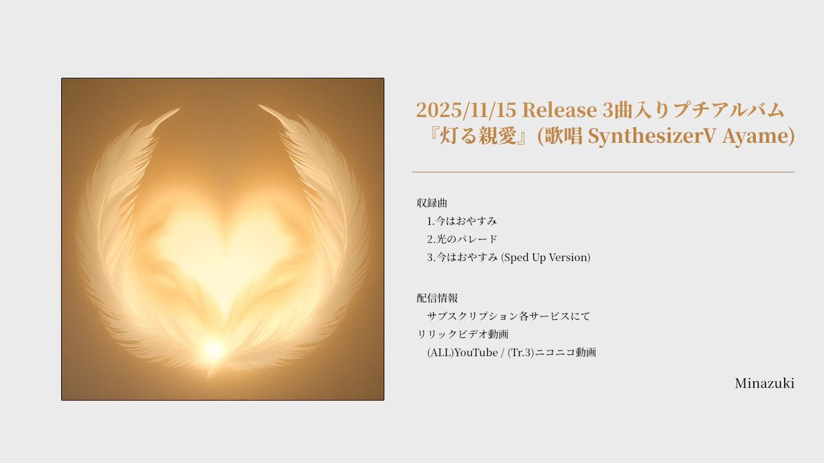 3曲入りプチアルバム『灯る深愛』2025/11/15より配信開始します。すべて歌唱はSVのAyame、ワンハーフのショート尺で、2010年代を感じさせるバラード2曲+SpedUp1曲を収録。 ぜひ聞いていただければと思います!動画公開されたらリマインドでポストします。 #オリジナル曲 #DTM #tunecore pic.x.com/gZ86bNHNnC