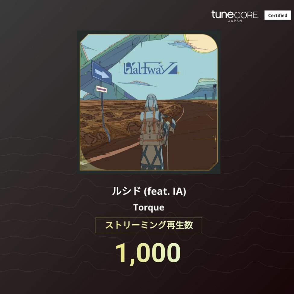 ルシド / Torque feat. IA のストリーミング再生数が 1,000突破したそうです 感謝㊗️🎉 @TuneCoreJapan milestone.tunecore.co.jp/milestones/W1r… #TuneCore pic.x.com/HM3GsD4zl1