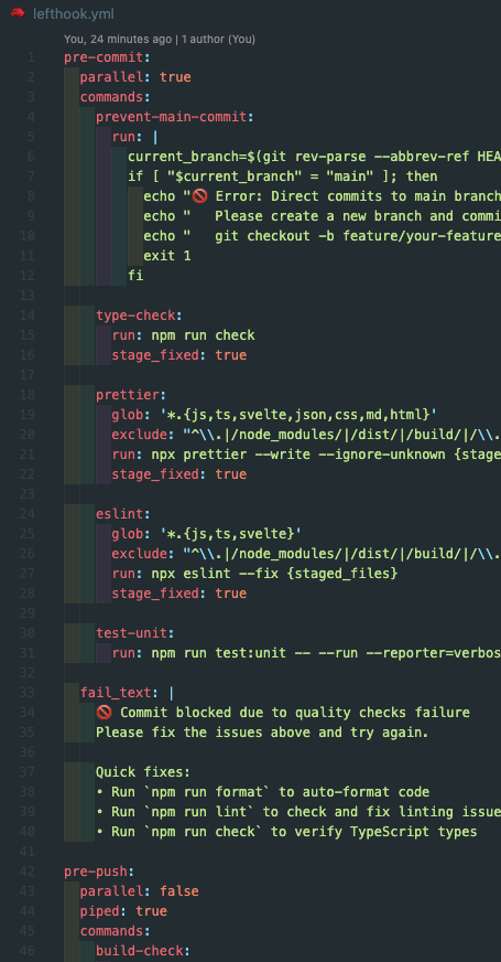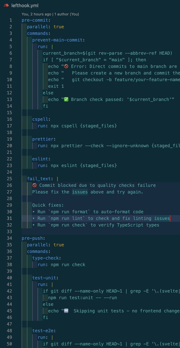 進捗報告 Git hooks ってのは、Git のコミットとかプッシュの前になんか実行させることができる仕組み。 main にコミットしてない?エラーは無い?フォーマット大丈夫?みたいな確認に使います。 書けた #ゲーム制作 #ゲーム開発 #gamedev #indiedev #Svelte #SvelteKit #TypeScript #JavaScript pic.x.com/KAI7Q8Sbwf