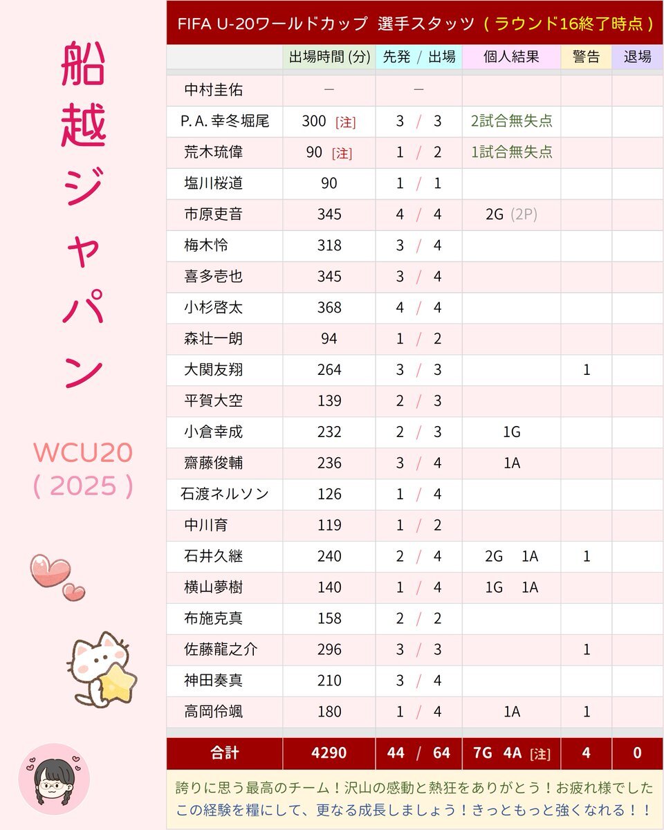 ⊹ 選手達の大会スタッツ ⊹ ❤️|WCU20 船越ジャパン 📊|U-20日本代表 選手スタッツ 📋|ラウンド16終了時点(最終結果) 🇫🇷|2025.10.08 フランス戦 ✍️|出場状況、個人GA数、警告や退場 #船越ジャパン #U20日本代表 #WCU20 #U20ワールドカップ #daihyo x.com/mika_pontaro/s…