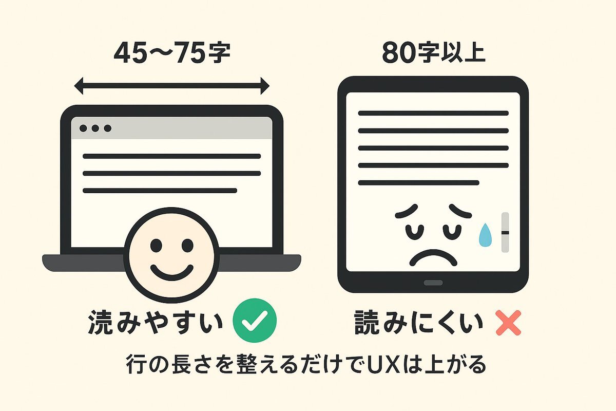 WebサイトUX改善術 読みやすい文字数編👀 1行あたりの文字数は 45〜75字 が最も読みやすいとされています。 80字を超えると視線の移動距離が伸び、読解スピードが落ちる。 Webでもアプリでも「行の長さ」を整えるだけでUXは改善します。 #UX設計 #タイポグラフィ 参考: baymard.com/blog/line-leng… pic.x.com/6Ee1wIWAp7