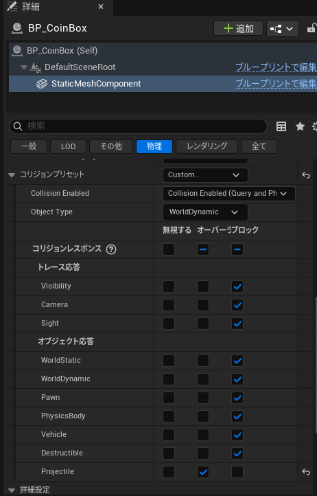 解消できた☺️ Coin用のオブジェクトチャンネルを作って、コインのコリジョンプリセットに設定。 BoxはCoinのオブジェクトチャンネルは無視するに設定。 おぼえたら意外とカンタンでしたね😉 #UE5 #UnrealEngine #Devlog pic.x.com/rYK4q65SFR
