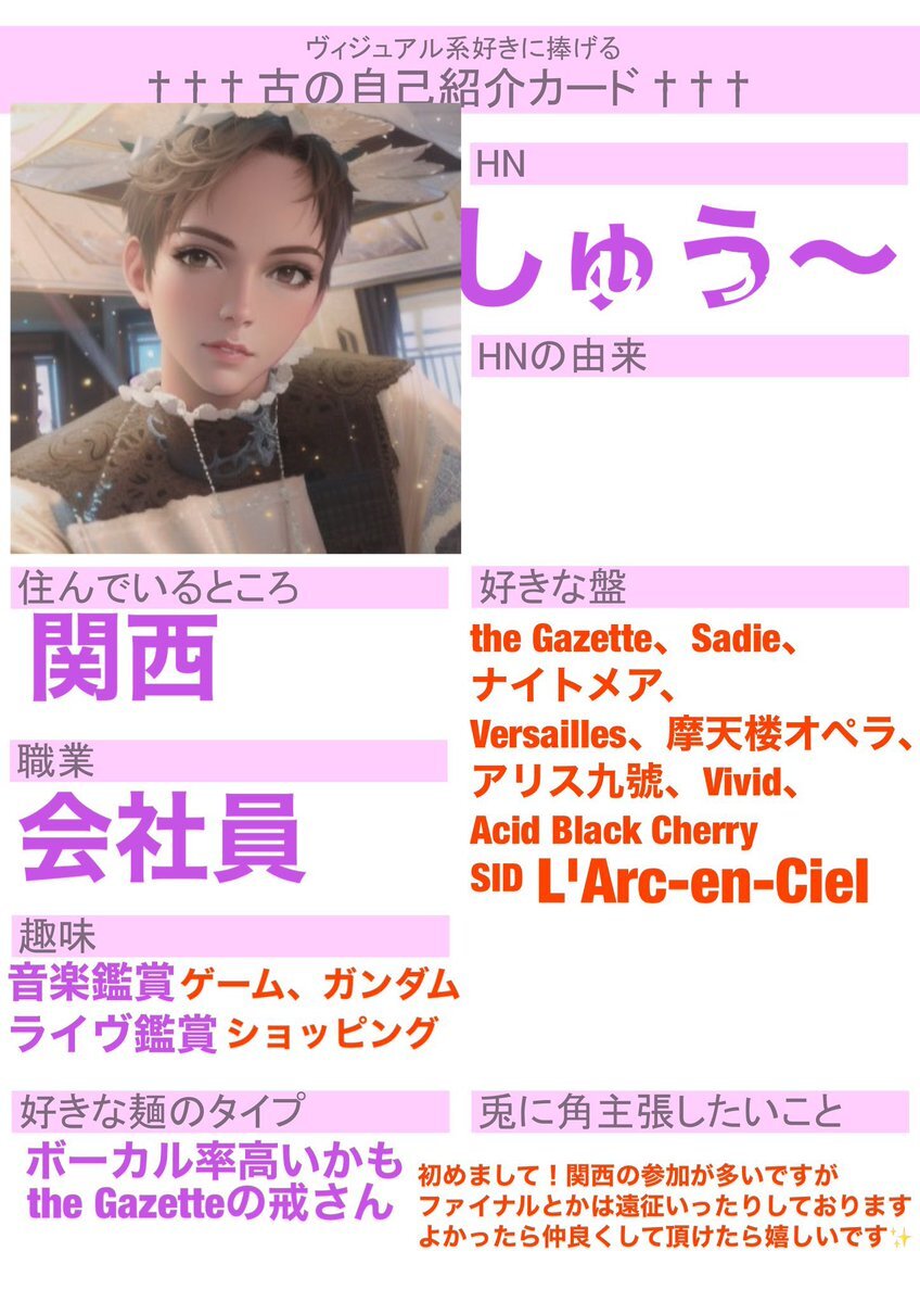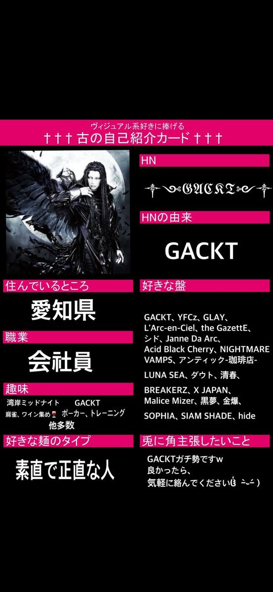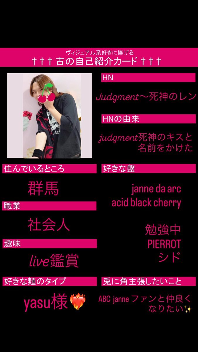 改めてまして!✨ 今更ながら自己紹介カード作りました‼️笑 #古の自己紹介カード #バンギャさんと繋がりたい #V系好きな人と繋がりたい #AcidBlackCherry #JanneDaArc #Yasu pic.x.com/zrvuOzMmUs