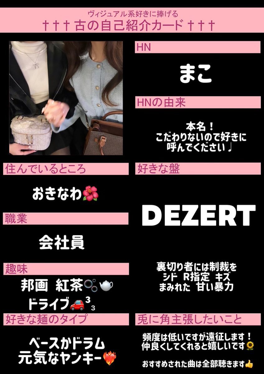 #古の自己紹介カード #V系好きな人と繋がりたい #バンギャさんと繋がりたい 一緒にライブ行けるお友達探してます₍ᐢ> ̫<ᐢ₎❣️ ♥で気になった方お迎え行きます💭 pic.x.com/kitNHd2aVE