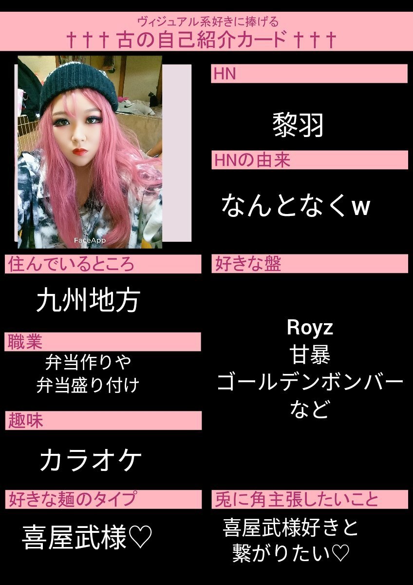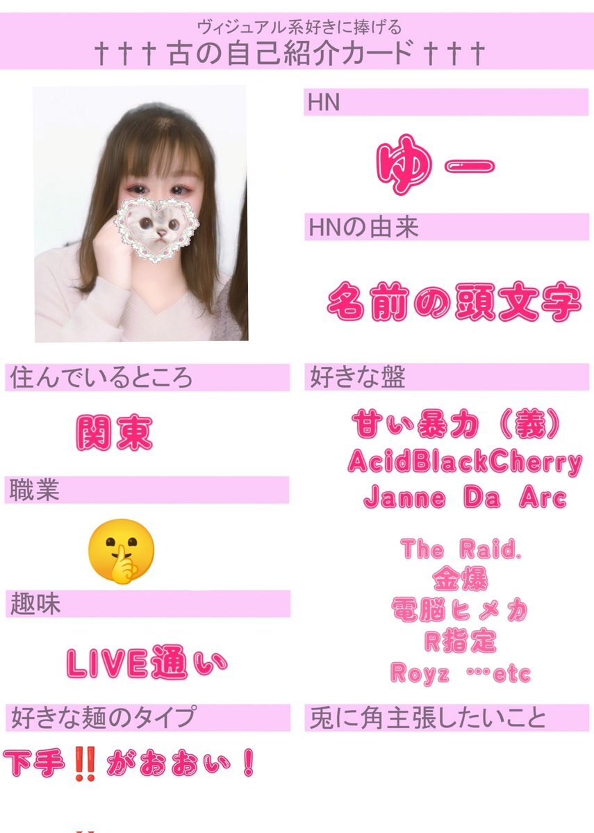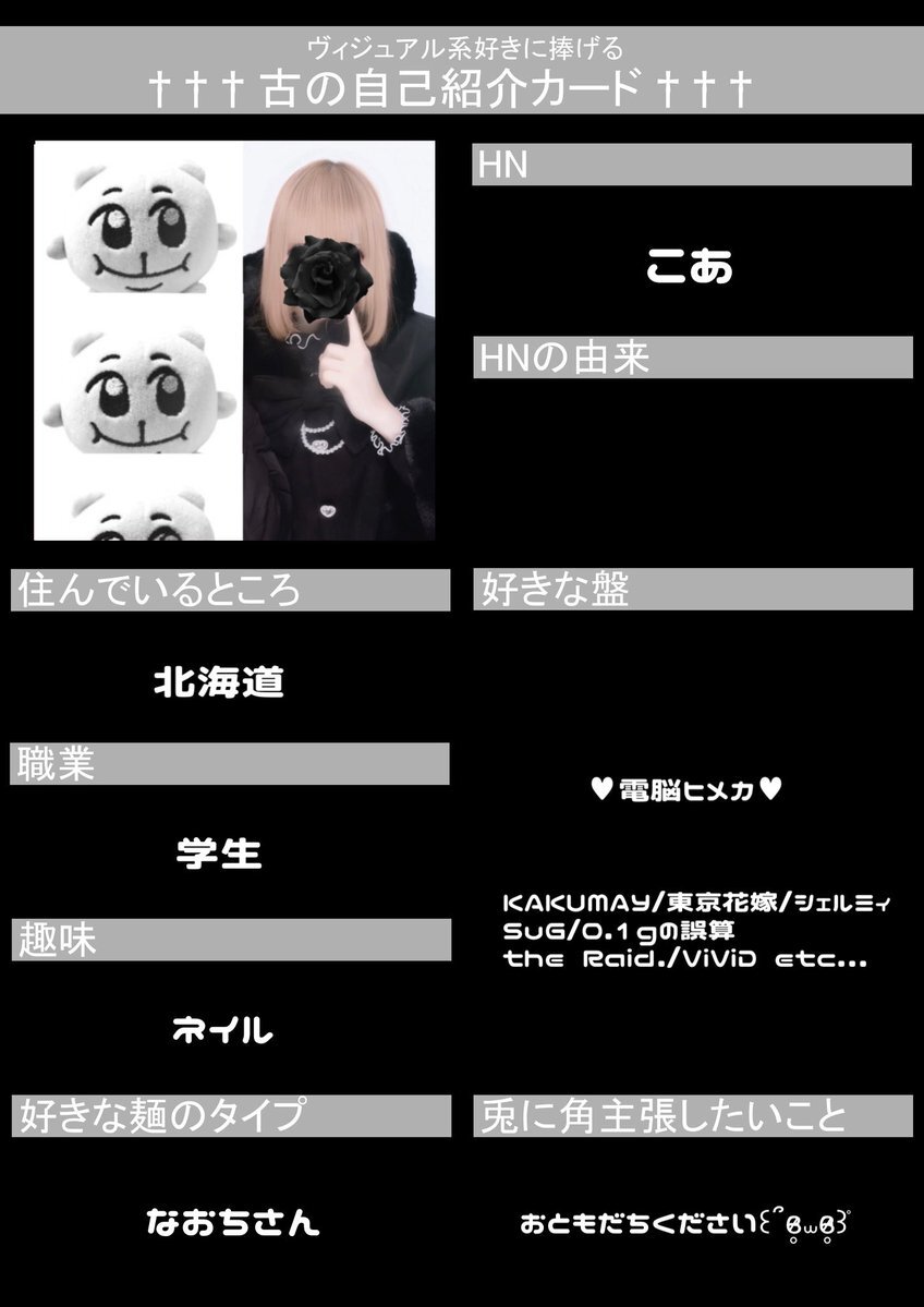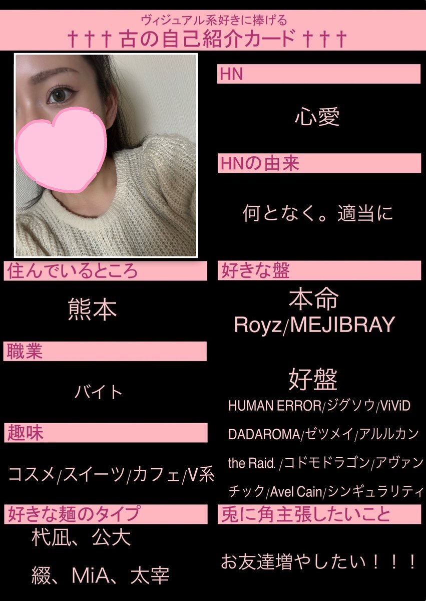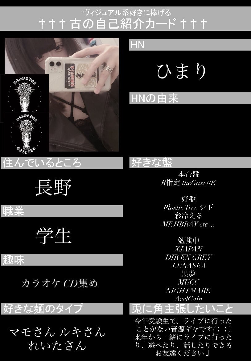 初めてですが作ってみました😖💦 お友達ほしいです!!! いいねor RTで気になった方お迎えします♡ 麺被り◎ 他盤◎ #古の自己紹介カード #バンギャさんと繋がりたい #ギャ男さんと繋がりたい #V系好きな人と繋がりたい pic.x.com/BcBMEA61wh