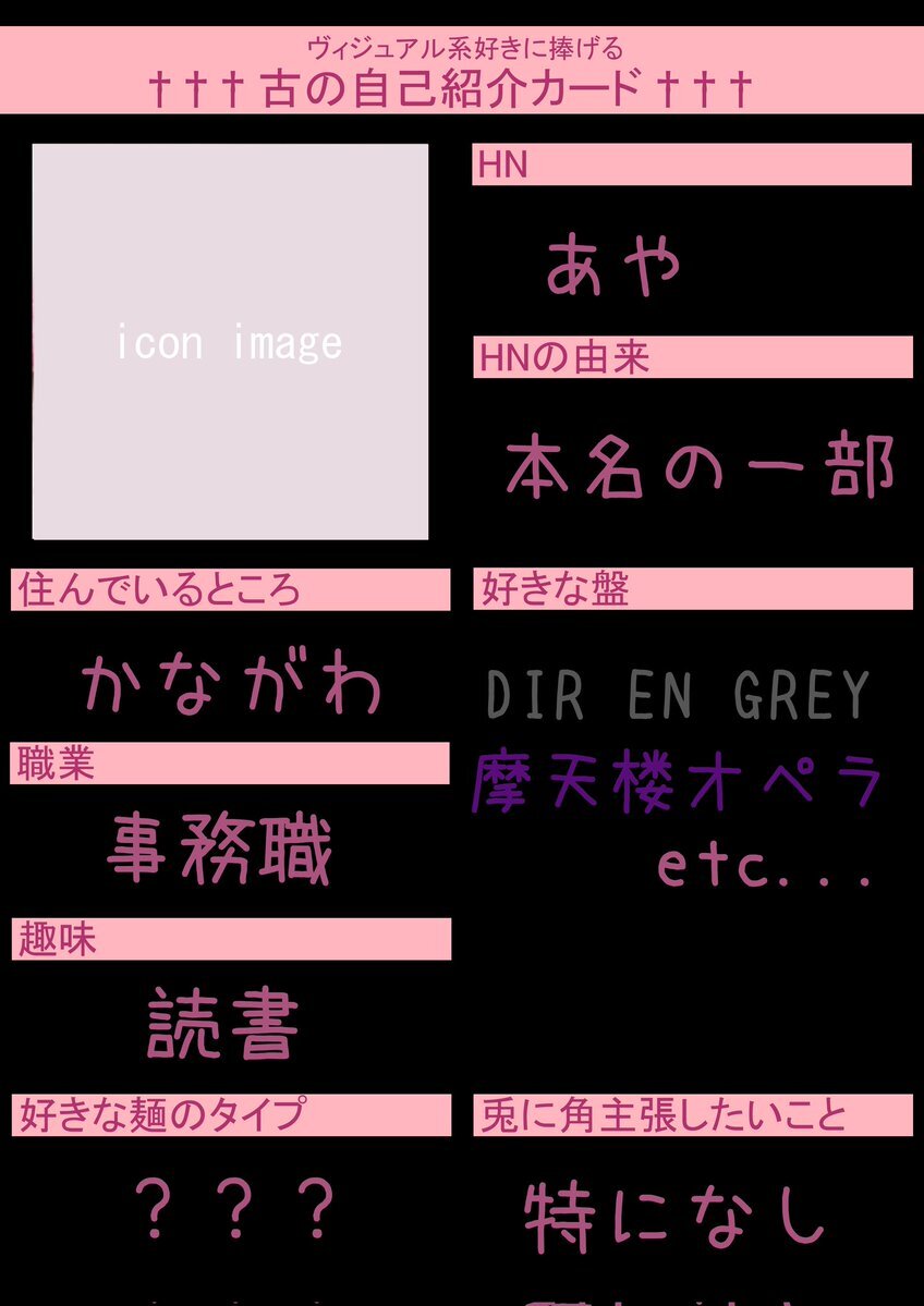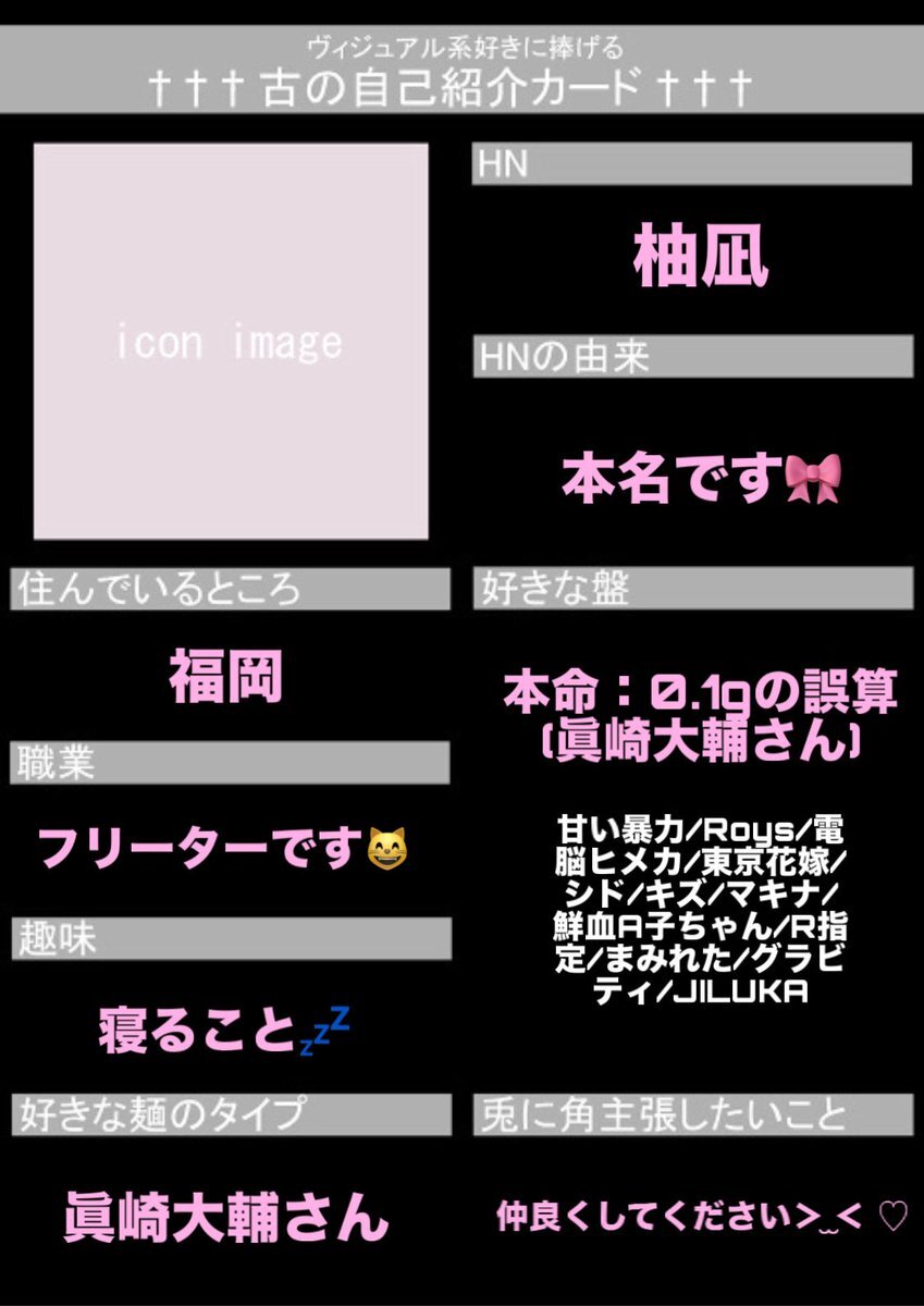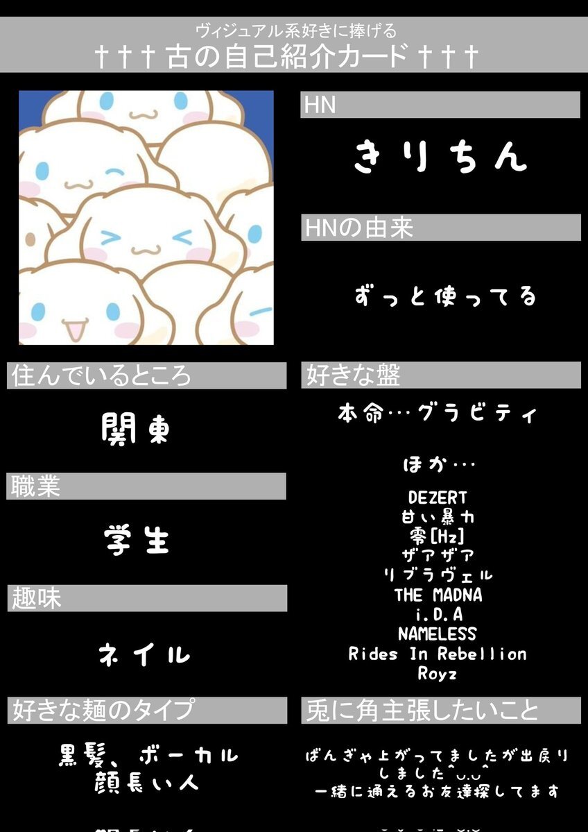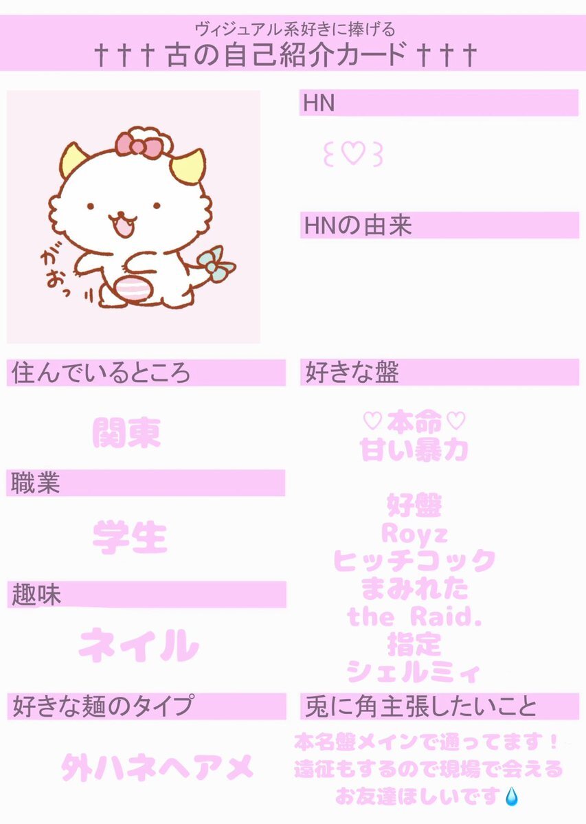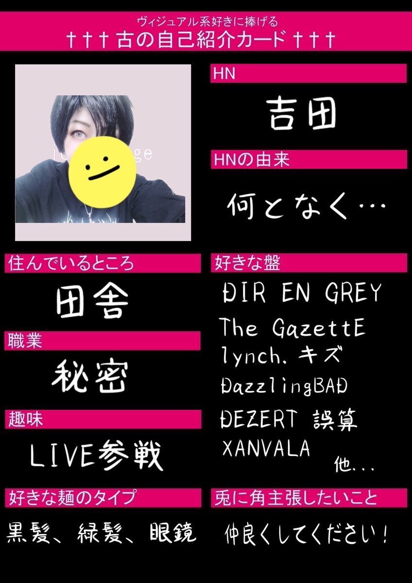 初めてですが作ってみました😖💦 お友達ほしいです!!! いいねor RTで気になった方お迎えします♡ 麺被り◎ 他盤◎ #古の自己紹介カード #バンギャさんと繋がりたい #ギャ男さんと繋がりたい #V系好きな人と繋がりたい pic.x.com/BcBMEA61wh
