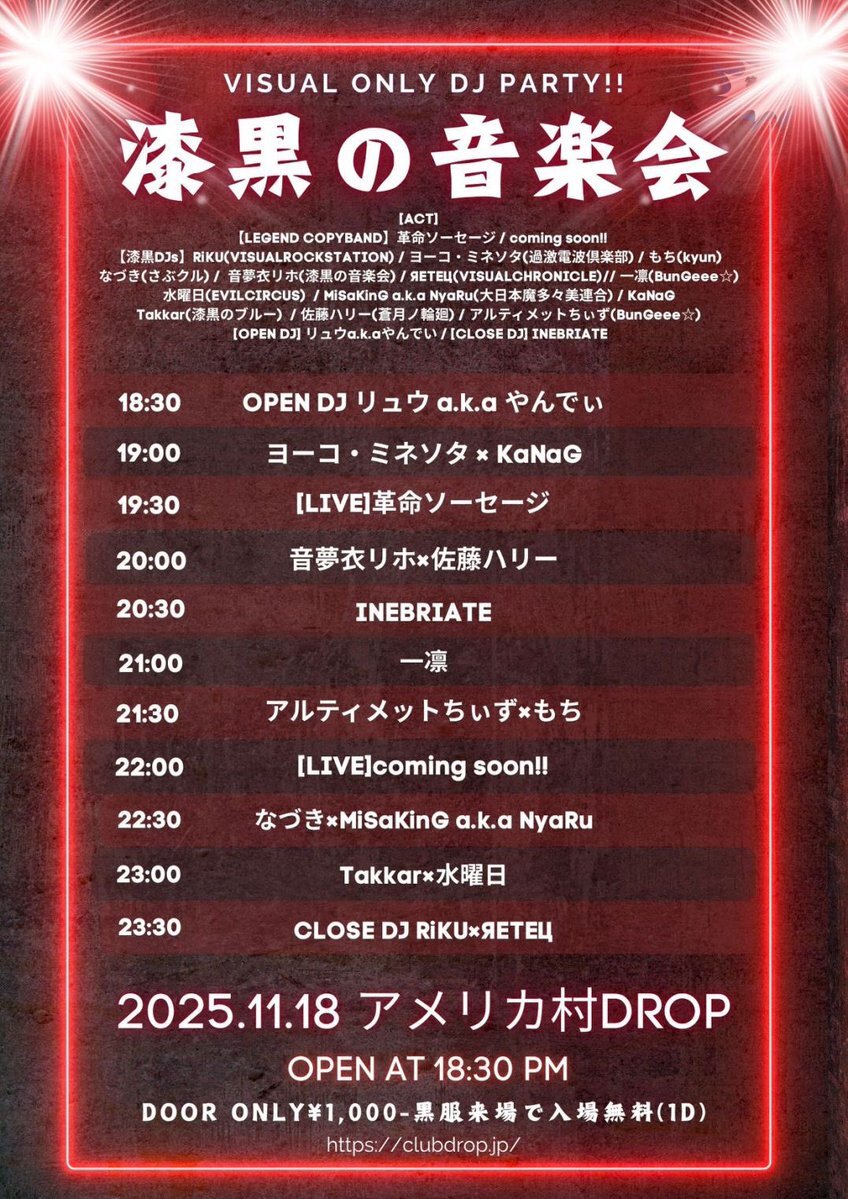 来週11/18(火)は 大阪アメ村のブラックレインボーこと ヴィジュアル系イベント 漆黒の音楽会です👏👏 我々のベースキャンプでもあるアメ村心斎橋ドロップでV系ライブ&V系DJの2本立で毎回お送りしています 今回も狂喜乱舞、動転境地の素晴らしい夜になる事間違いなしです😆✨
