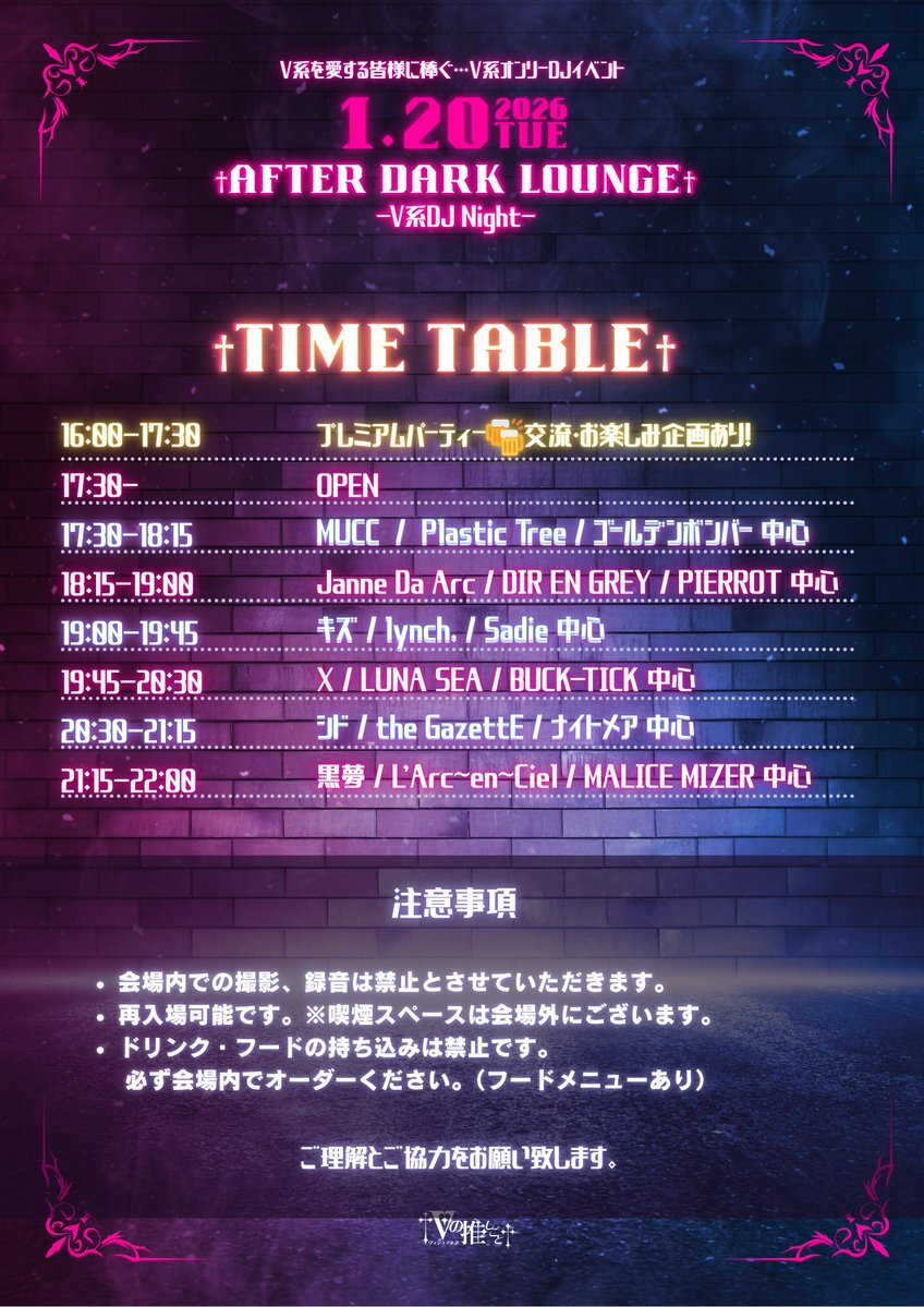【✝️タイムテーブル公開✝️】 †After Dark Lounge† -V系DJ Night- タイムテーブルが決定しました!† 当日ご来場の際はご注意事項も併せてご確認ください。 チケット販売中(下記リンクよりお求めください) #ダークラ #V系 #ヴィジュアル系 #DJイベント #V系DJ #V系好きな人と繋がりたい pic.x.com/o8bmr8dqdD