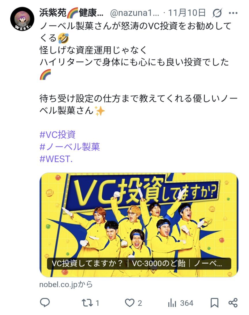 今年もお世話になります。ありがとうございます。 初めてTVのCMで見られた! #WESTꓸ @nobel_seika #VC投資