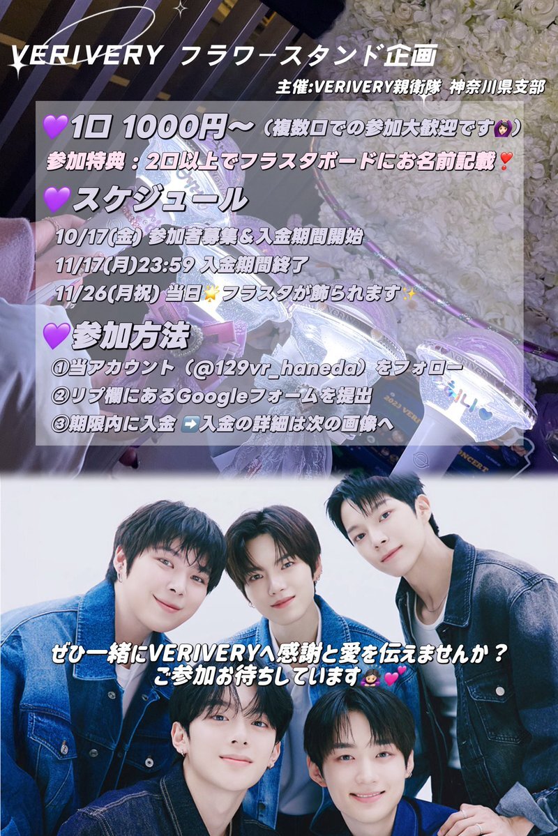 💜VERIVERY フラスタ企画💐💜 VERIVERYの再契約と日本ファンミーティングの開催をお祝いしてフラワースタンドを送りたいと思います🌟 現場に参加出来ない方やFF外からもお気軽にご参加ください🥹💕 みんなで感謝と愛を形にしましょう🫶🏻✨ #VERIVERY #베리베리 #verivery好きな人と繋がりたい #VERRER