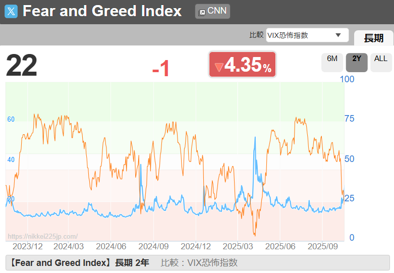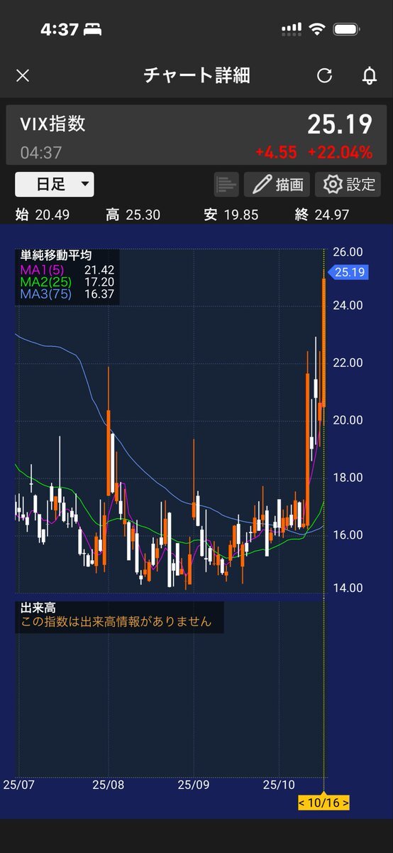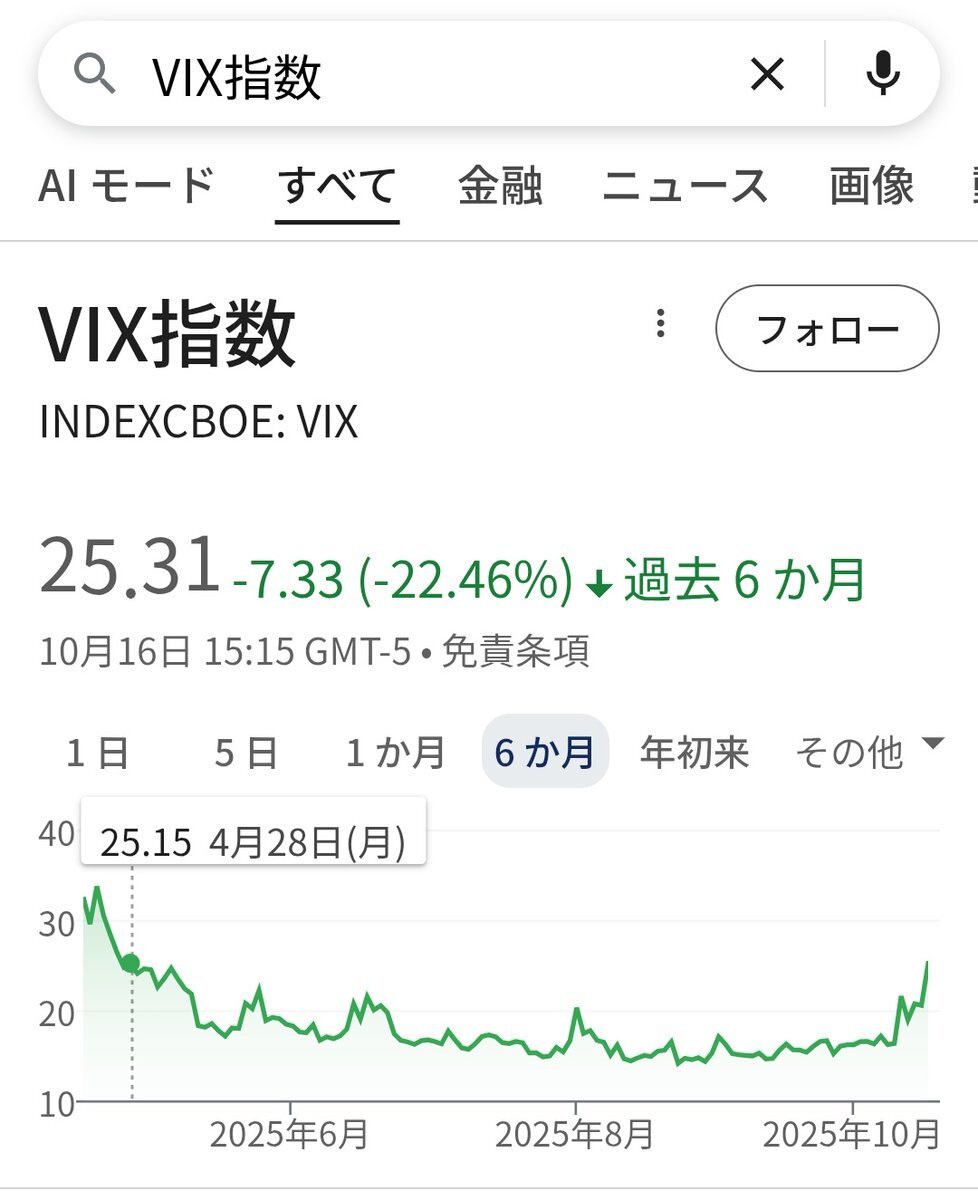 VIX指数。25を超えましたね。 今日は下げるかな? 半導体が下がって、高市関連株はあげるかな? #株式投資 #VIX指数 pic.x.com/PnX0QbDkHK