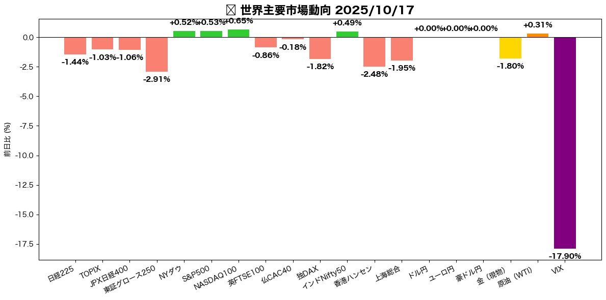 10月19日マーケットチェック✅  昨日グラフ公開できなかったので、17日金曜日までの流れを振り返りました。 VIXが-17.9%、金も-1.8%と下落📉 リスク回避姿勢?市場は落ち着きを取り戻しつつありそう。 良い1日をお過ごしください🎌 #VIX指数 #ゴールド #投資 pic.x.com/Pl1uyX5cDa