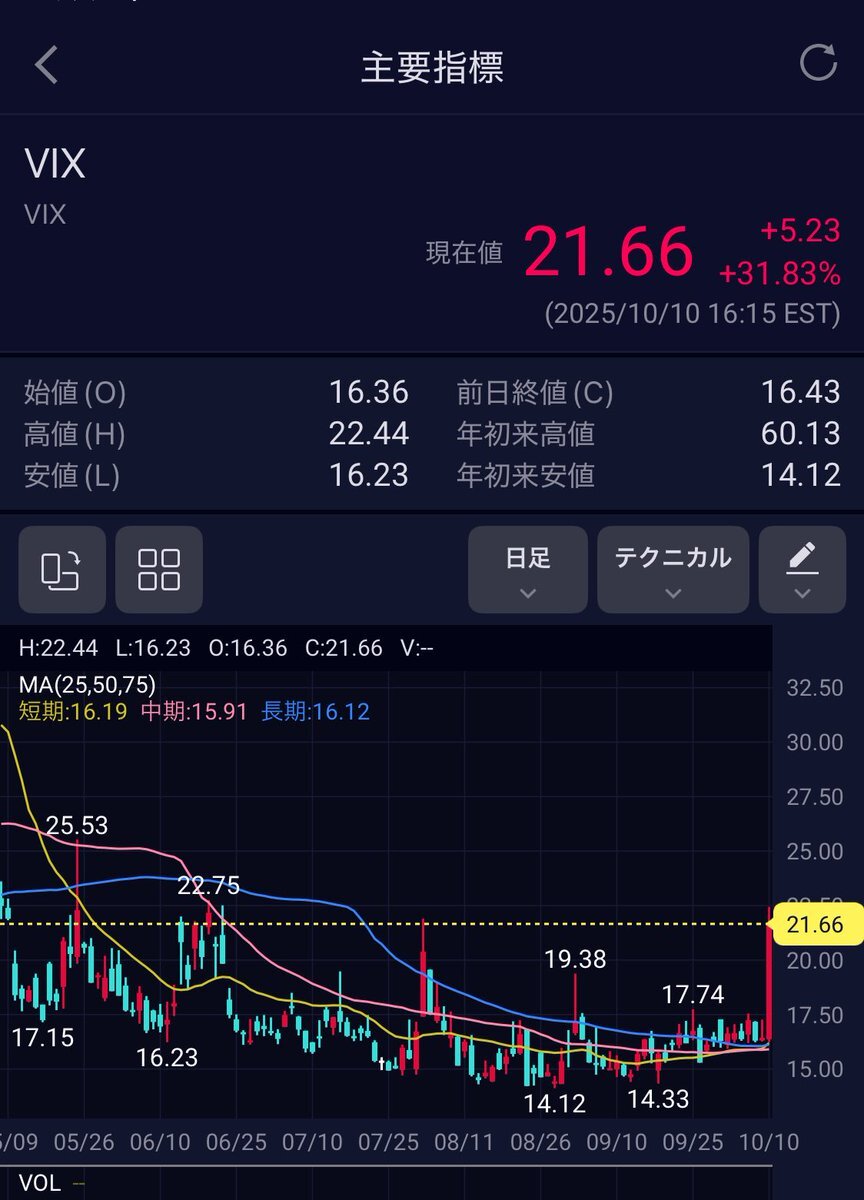 4月28日ぶりに #VIX指数 が25をこえました 🦀💴準備だ〜 pic.x.com/TMcheY2mhC x.com/NASDAQ100000/s…