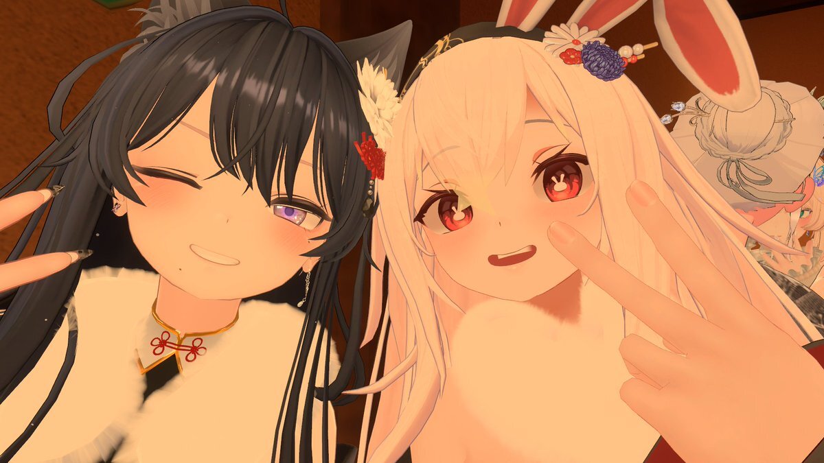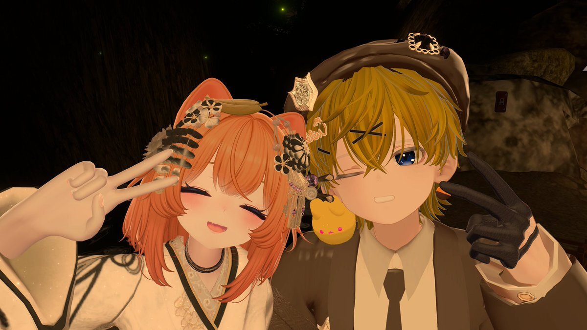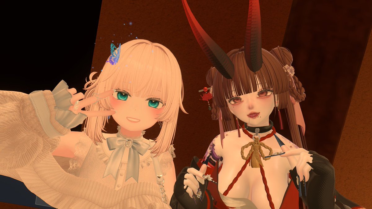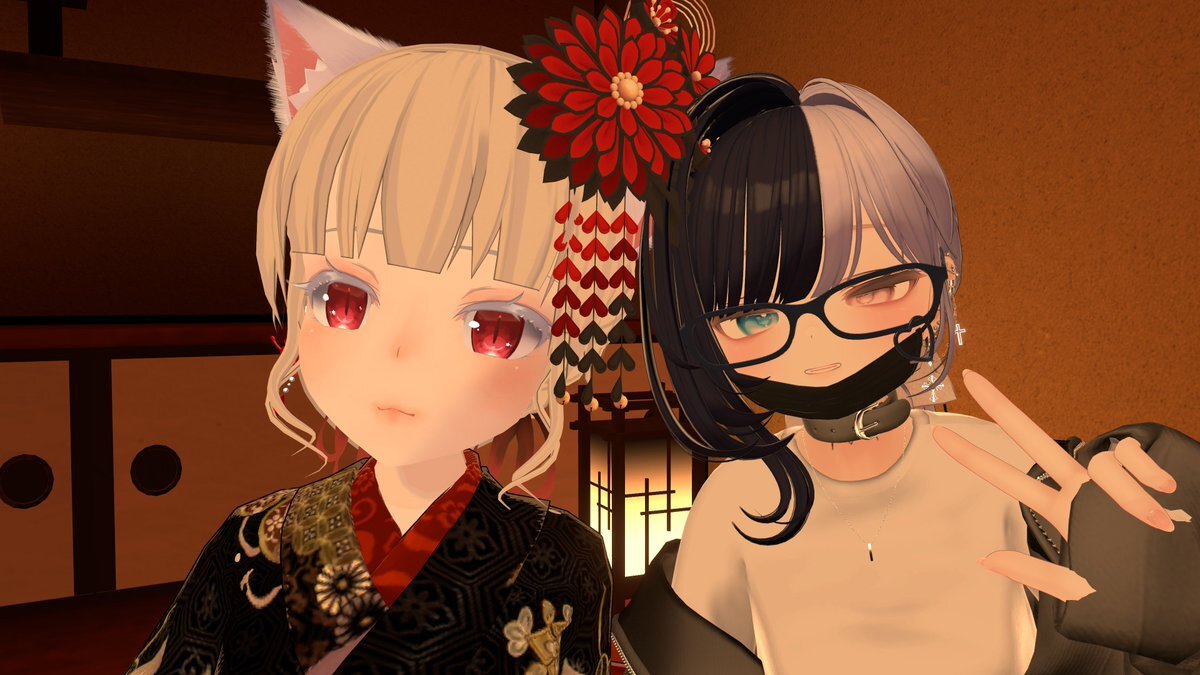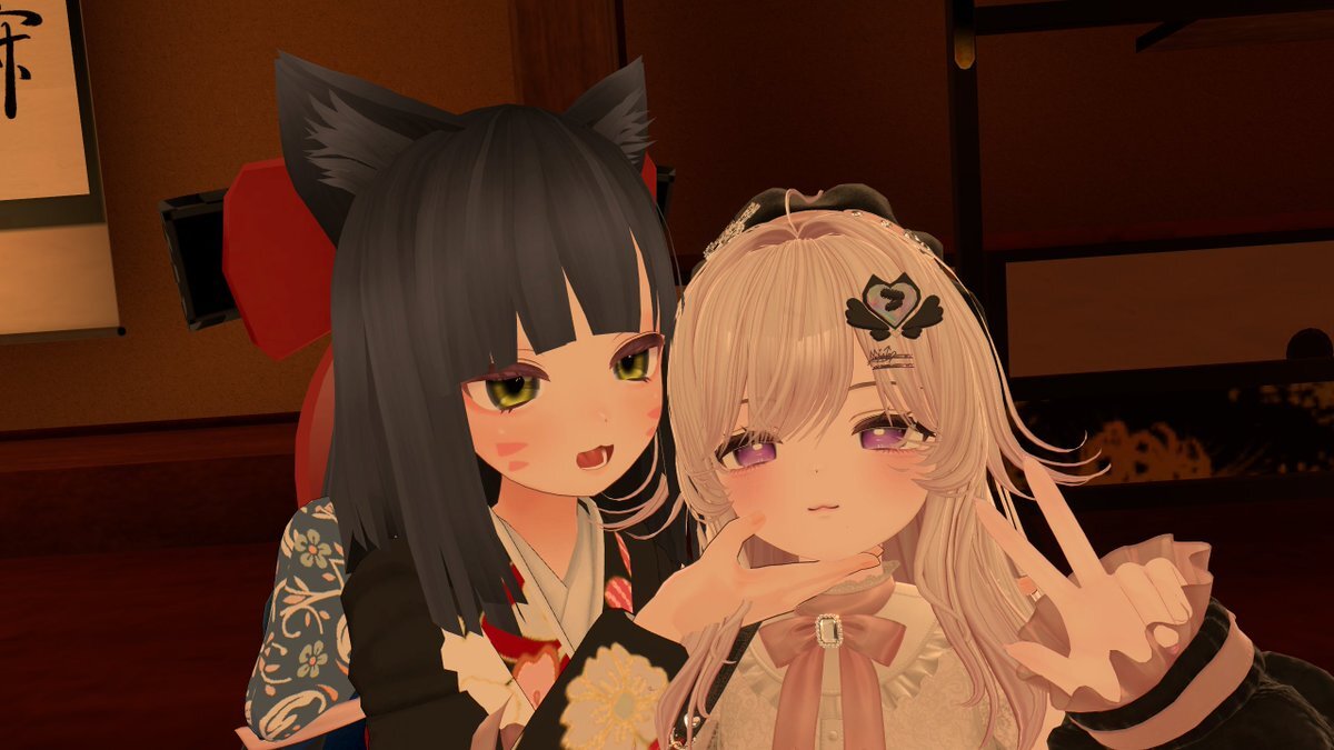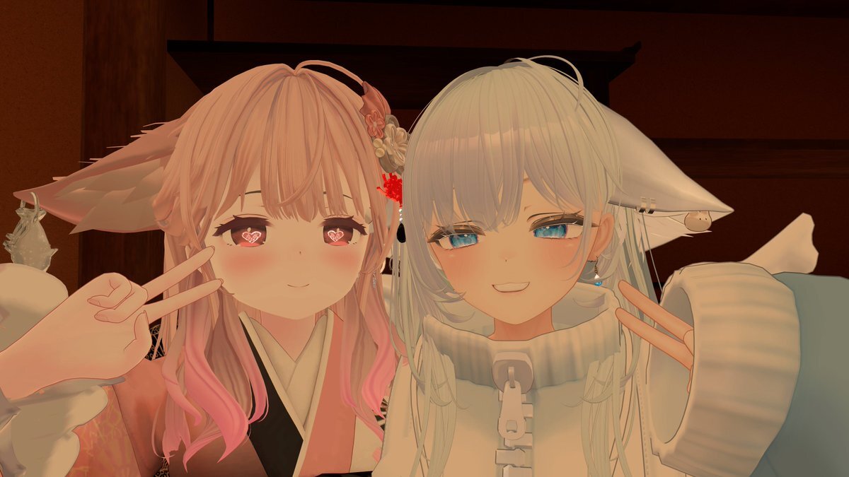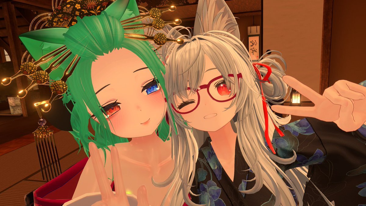 #VRCおうまがとき のアフターいってきましたー にゃおさんと! いっぱい洋服褒めてもらってとてもにこにこ! うささんと! おうまがときのうささんにも会えたらいいなーって…勝ちたい…! pic.x.com/DKELmBrLAD