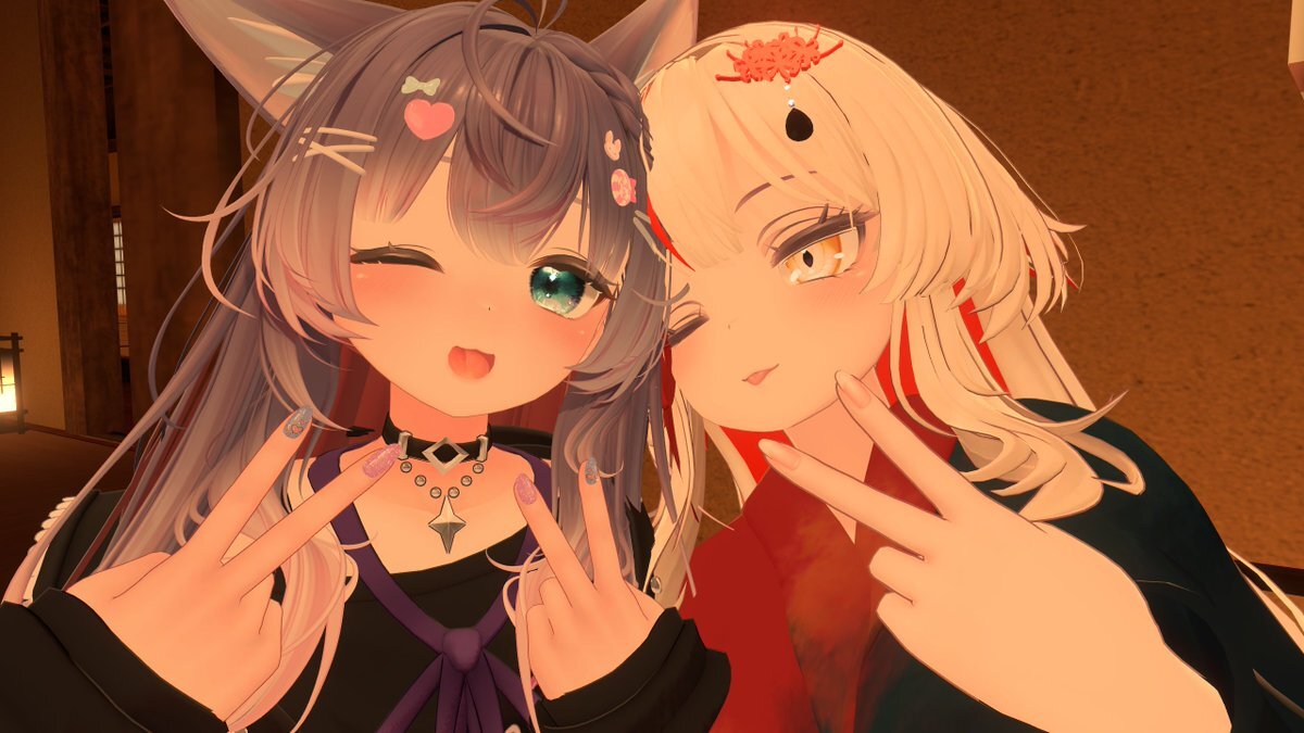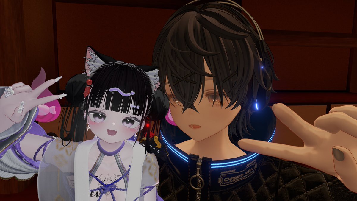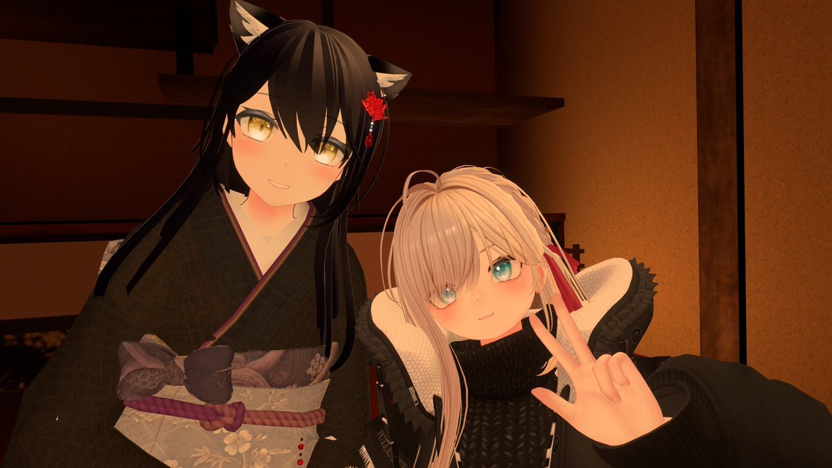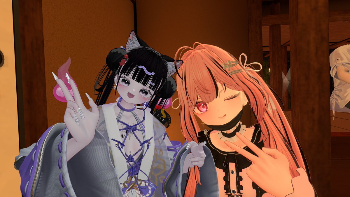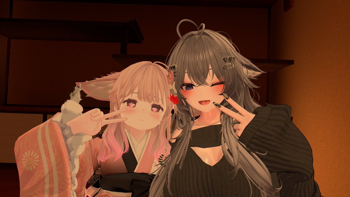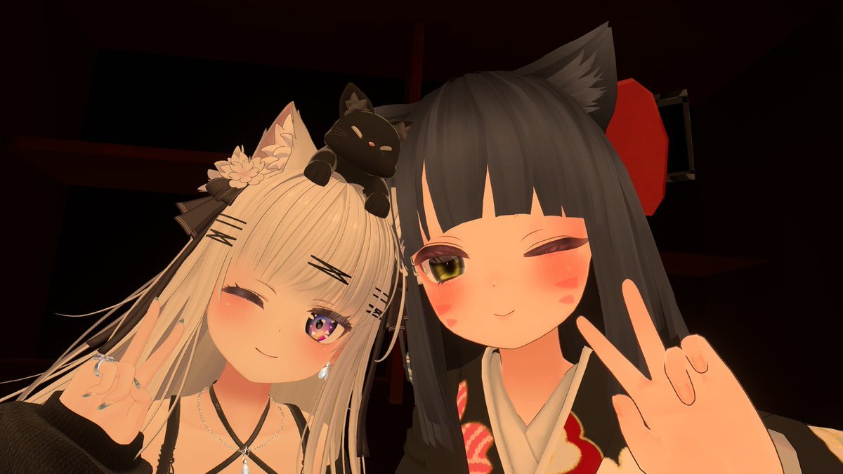 #VRCおうまがとき のアフターいってきましたー にゃおさんと! いっぱい洋服褒めてもらってとてもにこにこ! うささんと! おうまがときのうささんにも会えたらいいなーって…勝ちたい…! pic.x.com/DKELmBrLAD