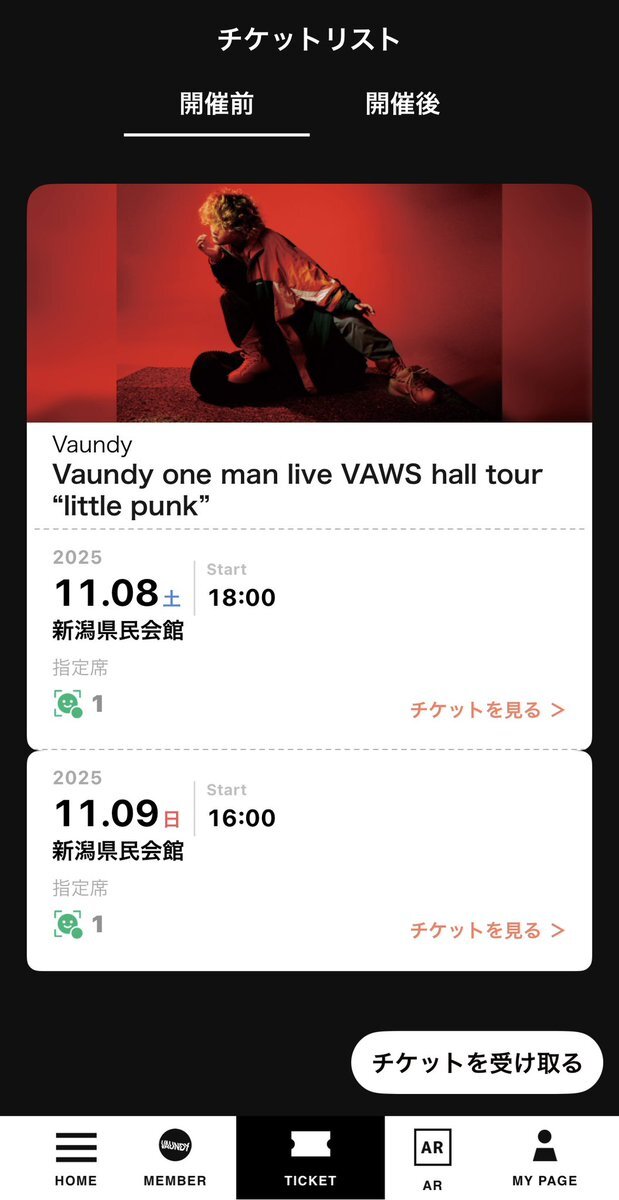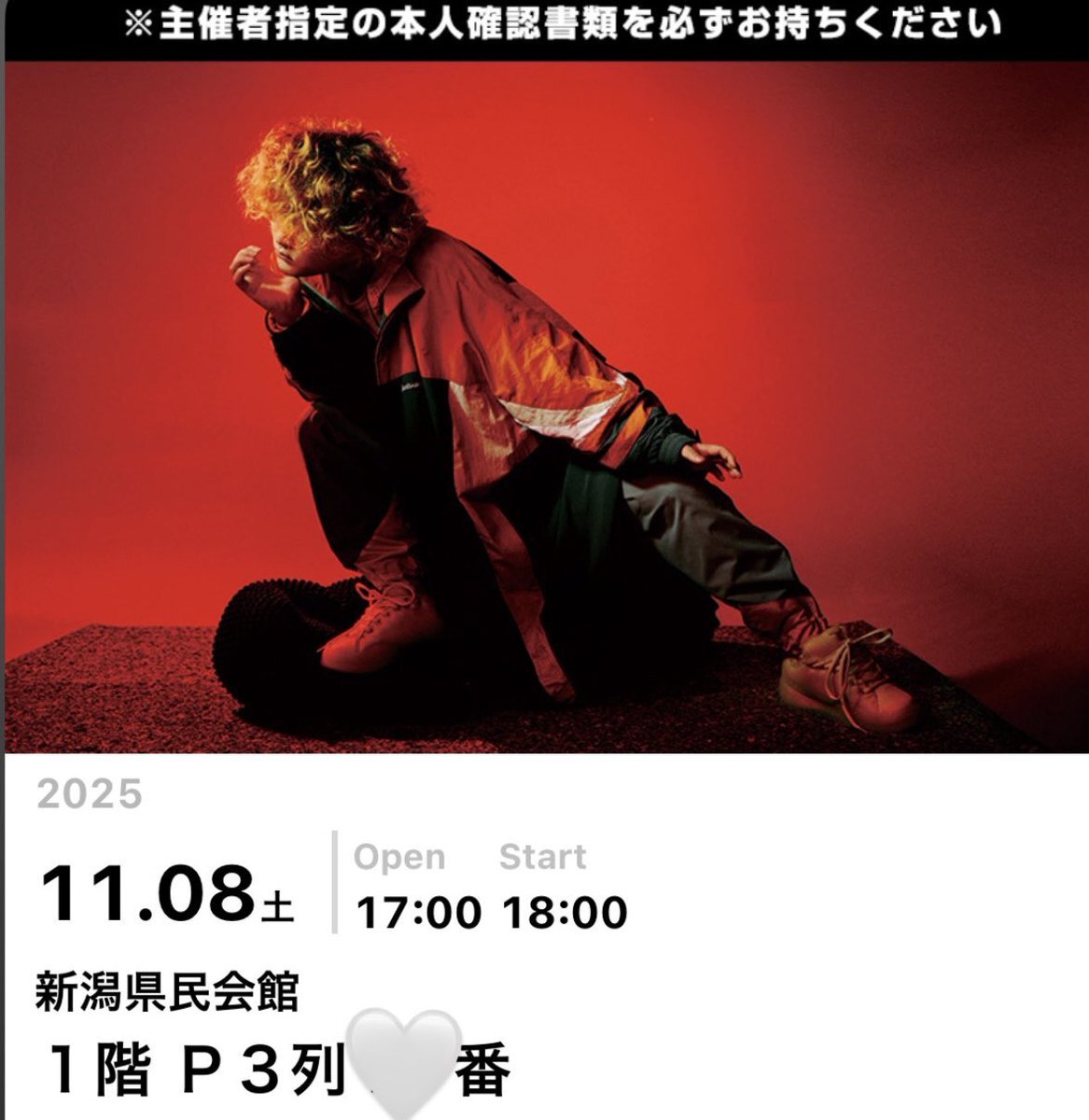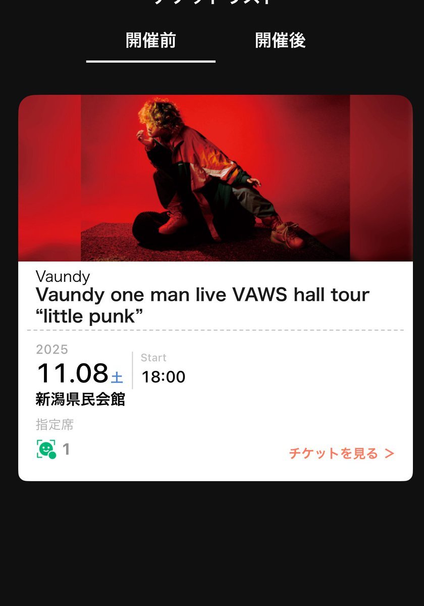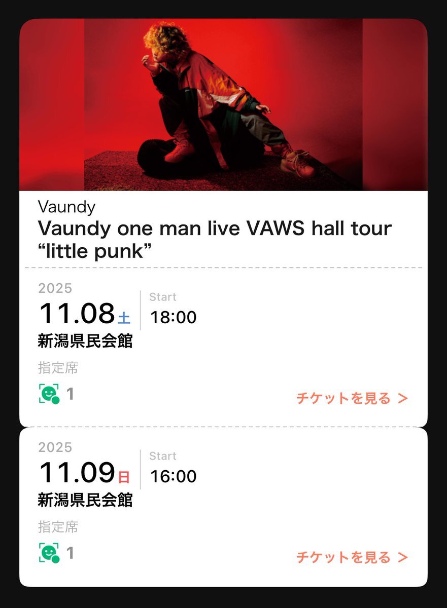 さっき座席が決まって、幻になったhitaruの席よりうんと後ろになっちゃったけど今度こそお願いしますよ?という気持ちで臨むのでバウ君ってば健康にはくれぐれも気をつけておくれよ(祈) はじめての新潟!あうう🤤 #Vaundy_littlepunk
