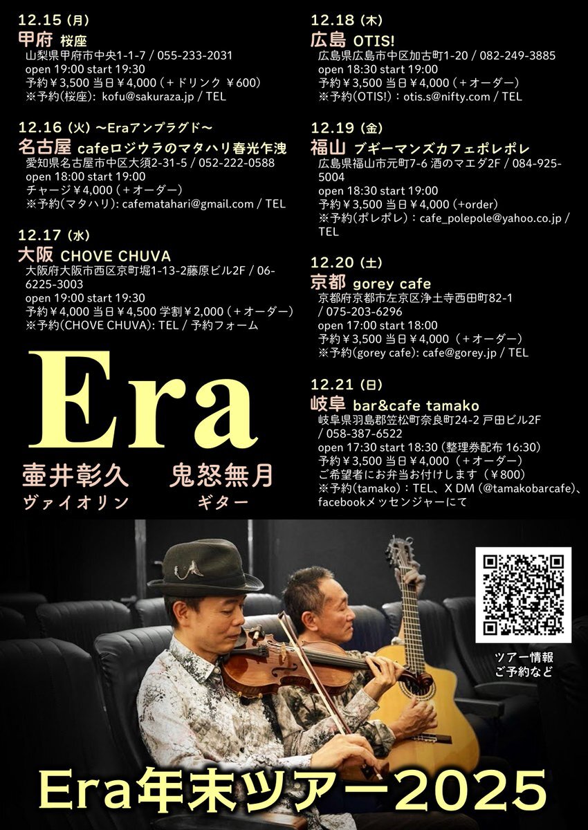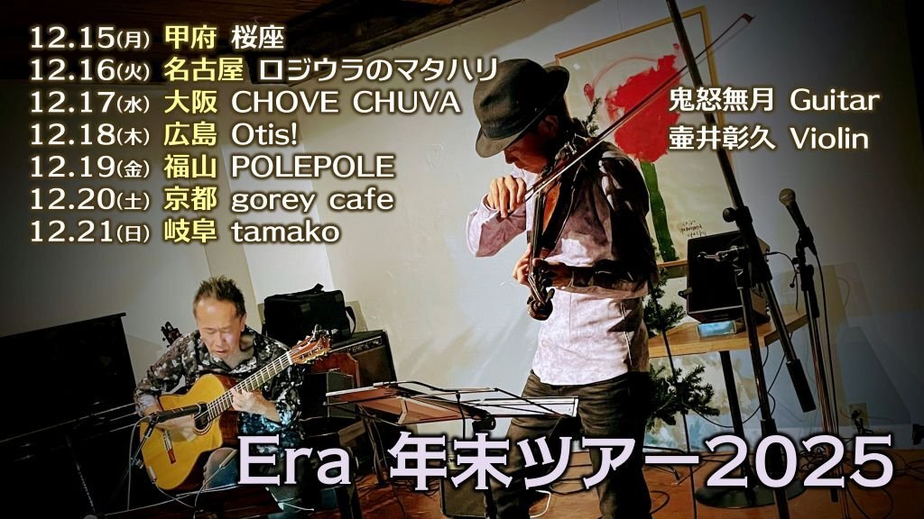 #ERA_LIVE ★来月!ご予約ぜひ!! 〜Eʀᴀ年末ツアー2025〜 12/15 甲府 12/16 名古屋 12/17 大阪 12/18 広島 12/19 福山 12/20 京都 12/21 岐阜笠松 tsuboy.com/era/2025/09/23… #guiter #violin #electricviolin #ギター #バイオリン #ヴァイオリン #live #ライブ #prog #プログレ pic.x.com/TxmlTqlYM2