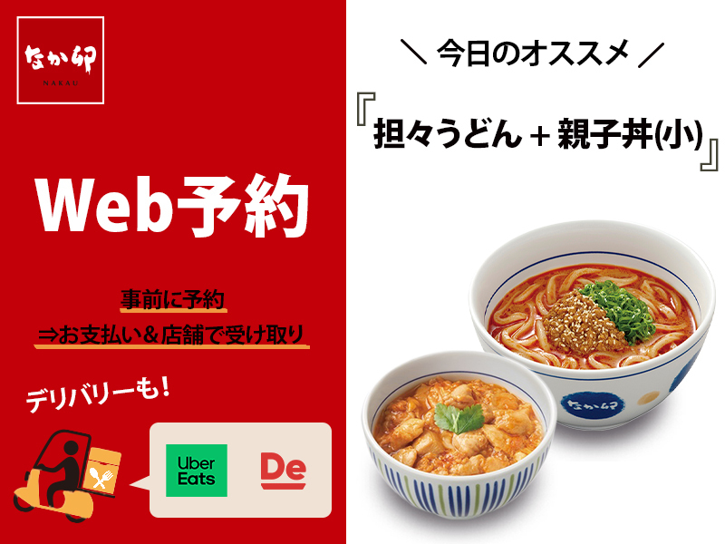 なか卯の #Web予約#デリバリー🍚 Web予約なら、事前に予約⇒お支払い&店舗でお受け取り🥡 今日のオススメは『担々うどん+親子丼(小)』 ゴマ香る旨辛な味わいの担々うどんと一緒に、定番の親子丼はいかが❓ 家でゆっくりしたい日はデリバリーも😊 ご予約👉bit.ly/45a35T5 #なか卯 pic.x.com/F3g6aCf8FY