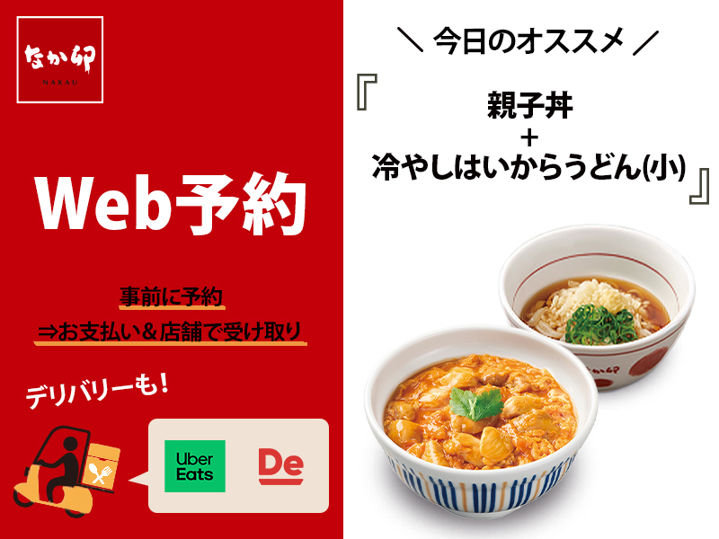 なか卯の #Web予約#デリバリー🍚 Web予約なら、事前に予約⇒お支払い&店舗でお受け取り🥡 今日のオススメは『親子丼+冷やしはいからうどん(小)』 ごはんもうどんも楽しみたい時にいかがですか☺️✨ 家でゆっくりしたい日はデリバリーも😊 ご予約👉bit.ly/45a35T5 #なか卯 pic.x.com/LmFnzo7GIP