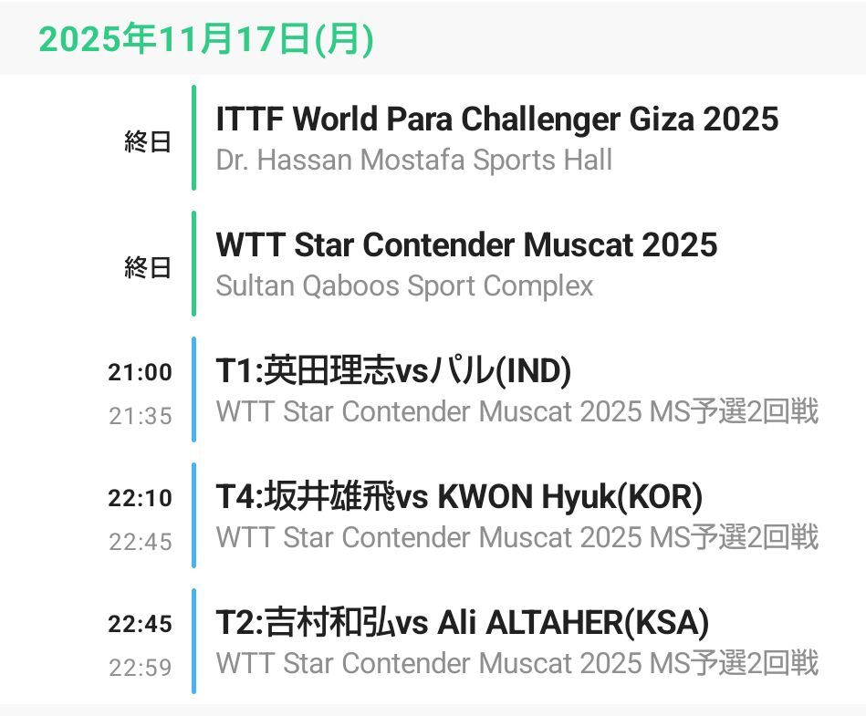 #WTTスターコンテンダーマスカット2025 今日11/17(予選1日目)の日本選手の試合スケジュール (日本時間は1時間足してください) 緑浜さん、入力ありがとうございます。 #卓球🏓 #WTT #WTTスターコンテンダー #WTTStarContenderMuscat #オマーン pic.x.com/g79jXglPOj