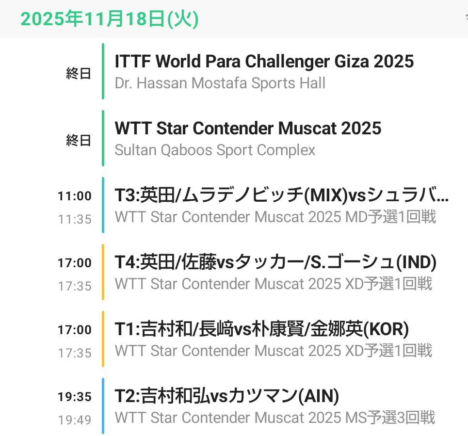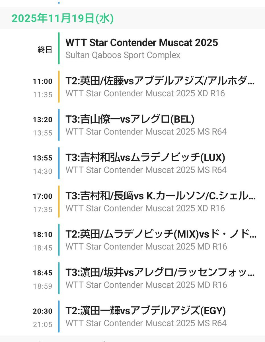 #WTT #WTTスターコンテンダーマスカット2025 今日11/19から本戦 今日の日本選手の試合スケジュール #卓球🏓 #WTTStarContenderMuscat #オマーン pic.x.com/vZecSH3zoC
