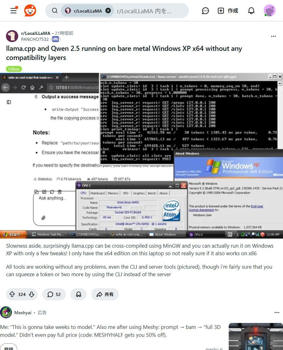 Windows XPで生成AIが動いたってマジですか!?🤖✨ 古いPCでもAIが使える時代がキター!Windows XPで「llama.cpp」と「Qwen 2.5」が動作した衝撃の報告です!AI活用がぐっと身近になりますね! #AI活用 #WindowsXP pic.x.com/xyso4mIYND