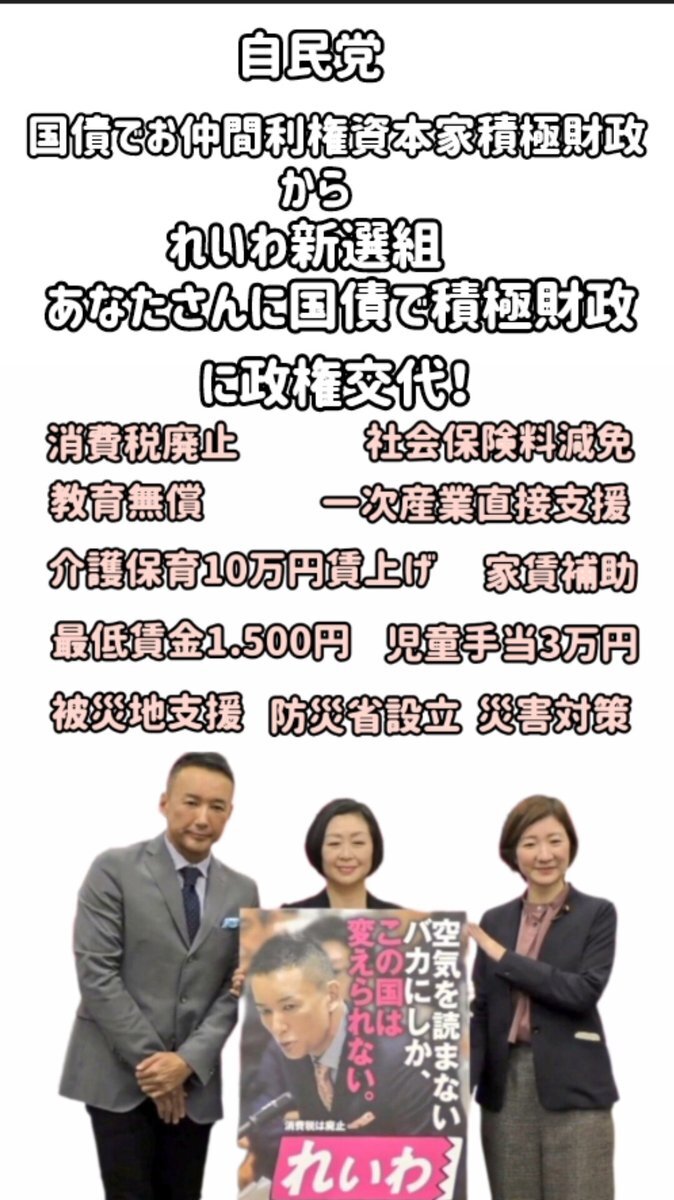 では #山本太郎が総理大臣 #れいわで国会を埋めよう #Xをれいわ新選組で埋め尽くせ #山本太郎を総理大臣に #山本太郎が日本を救う #消費税は廃止 #政治家はれいわ以外いらない x.com/DzkIRoTsc47202…