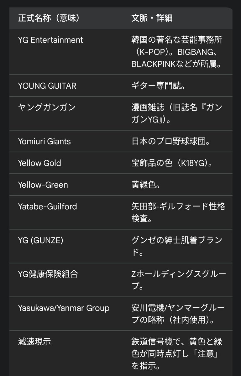GoogleのAIに「この世の中・世界における全てのYG」を調べさせてみた #YG安田 #安田悠馬 #RakutenEagles pic.x.com/3hoKjKIPPb x.com/nikkan_eagles/…